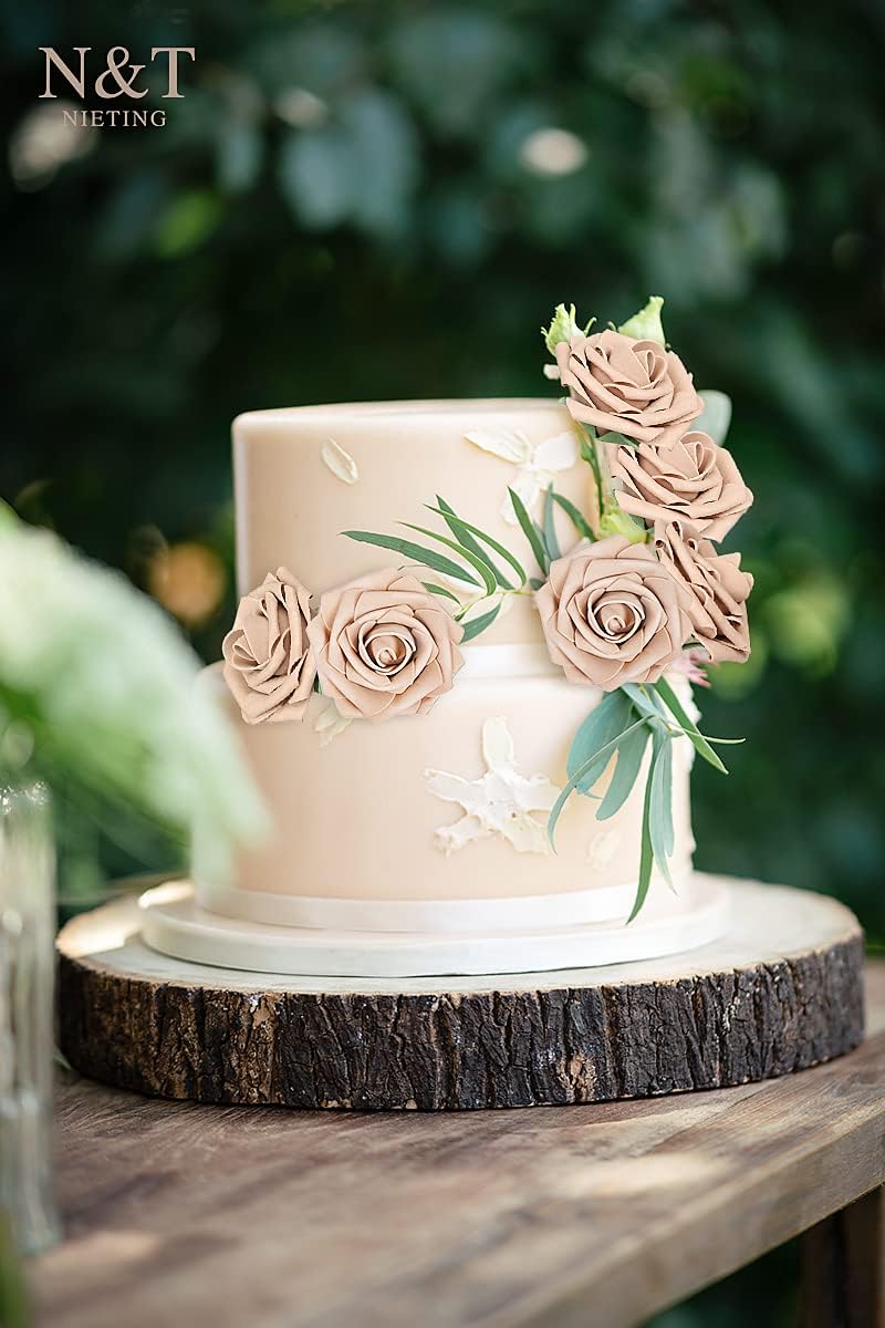 N&T NIETING Artificial Flowers Light Brown Roses, 50 Pcs Faux Flowers Fake Flowers Perfect for DIY Wedding Bouquets Centerpieces Birthday Party Home Flower Arrangement Decorations Fall Flowers