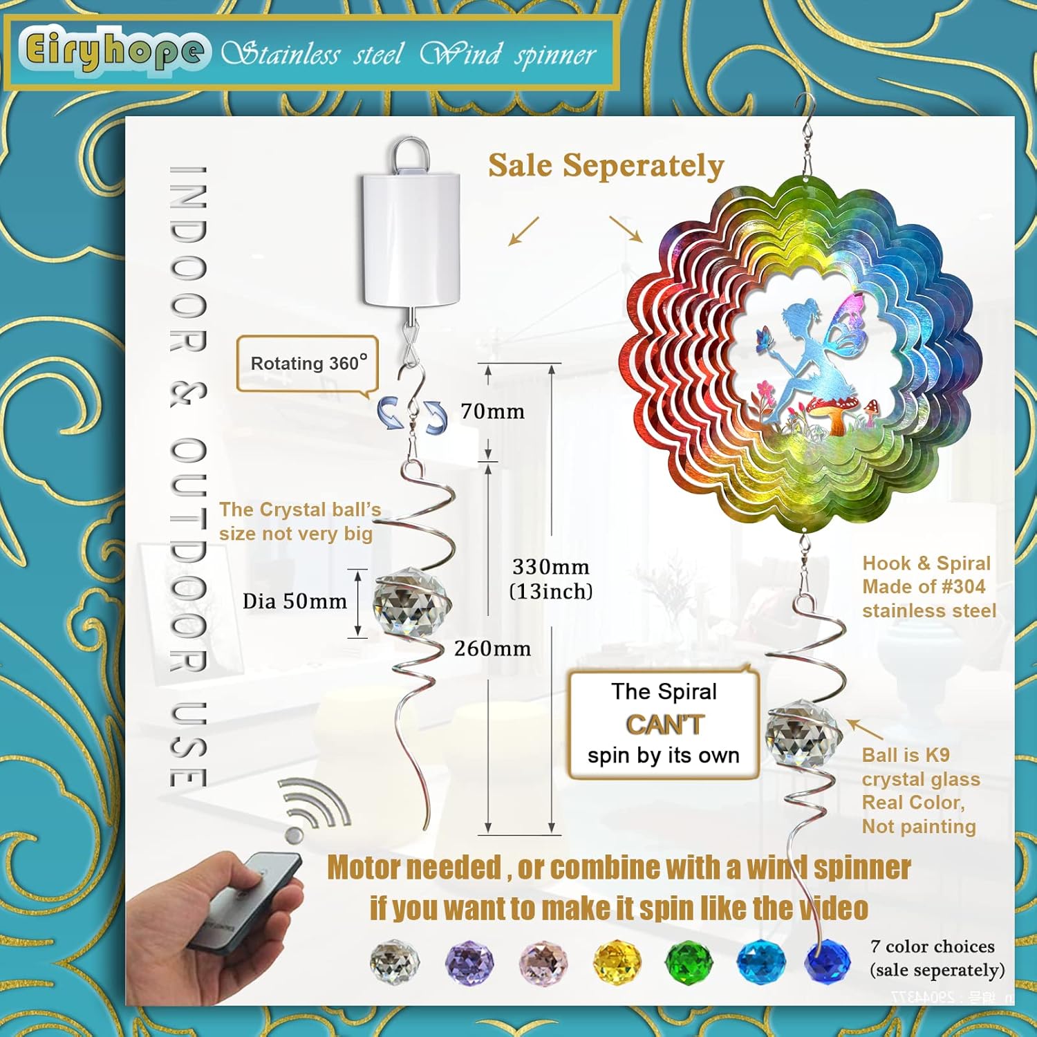 - 【 High Quality Gazing Ball Spiral Tail 】Eiryhope's 13 inch height stainless steel gazing ball spiral tail is made of high quality stainless steel spiral wire and top crystal material, with an 11 inch spiral tail and a 2 inch solid K9 crystal glass ball. Finely crafted, the crystal balls are highly clear and cast stunning rainbows that transform sunlight into a beautiful array of colors. The fabulous crystal ball adds a touch of glamour to this crystal tail spinner.
