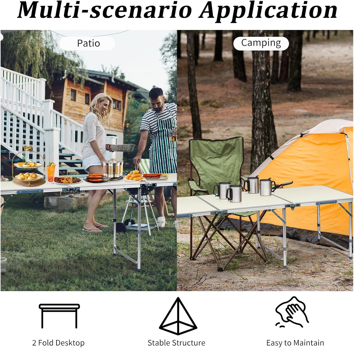 - ăCONVENIENT DESIGNăThe rv outdoor table can be easily opened in seconds with just a few simple steps. Quickly fold with the side locks and carry handle. The desktop features fiberboard that is easy to clean stains only by swiping. The 6ft folding table provide convenience in a variety of places for you