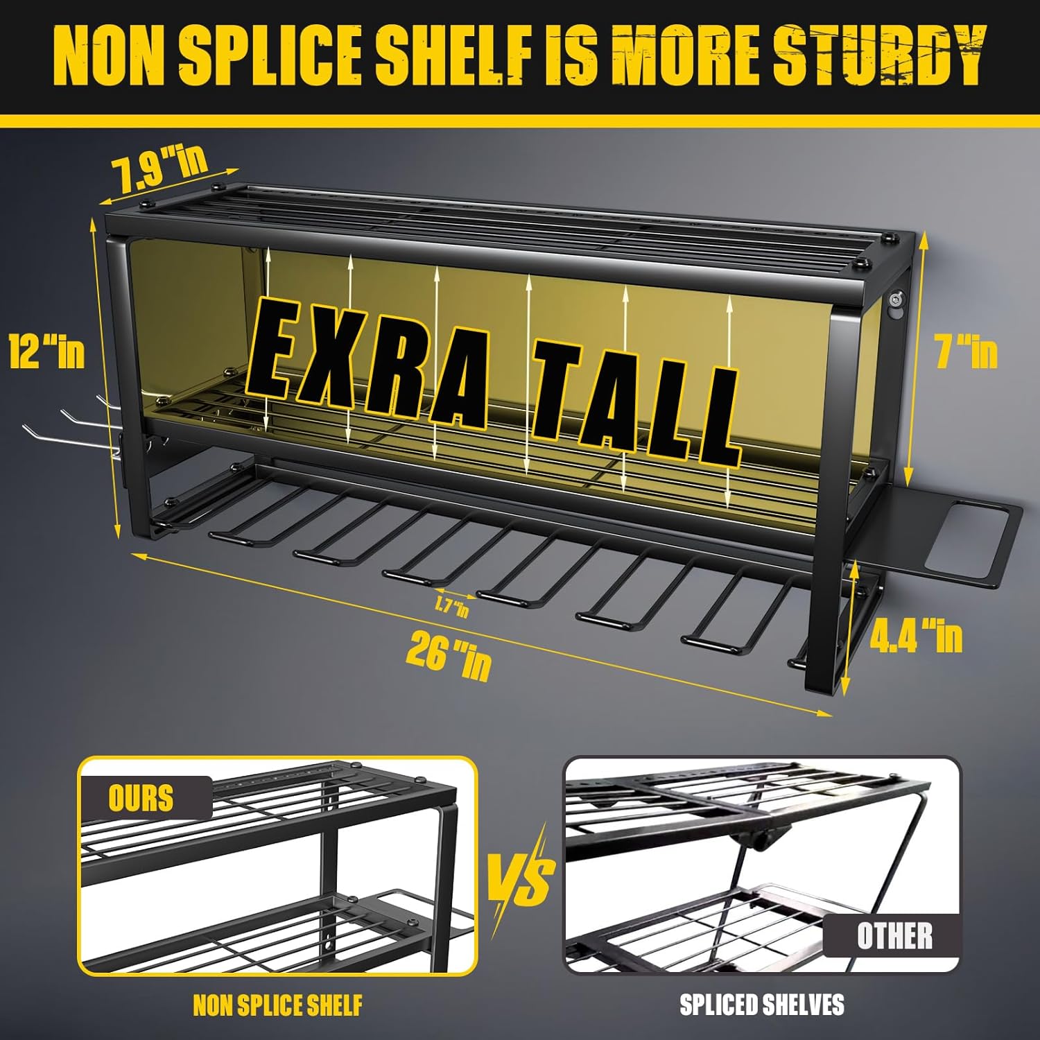 - 【HEAVY DUTY】:This tool shelf is made of heavy compact steel metal, and the joint of the shelf uses a reinforced design. With plenty of load-bearing testing, our tool storage rack can hold your power tools of any weight