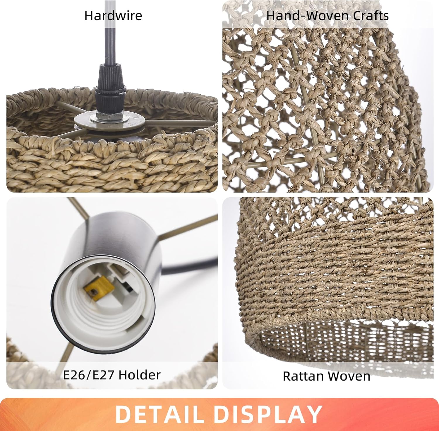 Arturesthome Boho Chandelier, Rustic Rattan Basket Woven Pendant Light Coastal Light Fixture, Farmhouse Wicker Hanging Lighting for Dining Table Kitchen Island Bedroom D17.7in