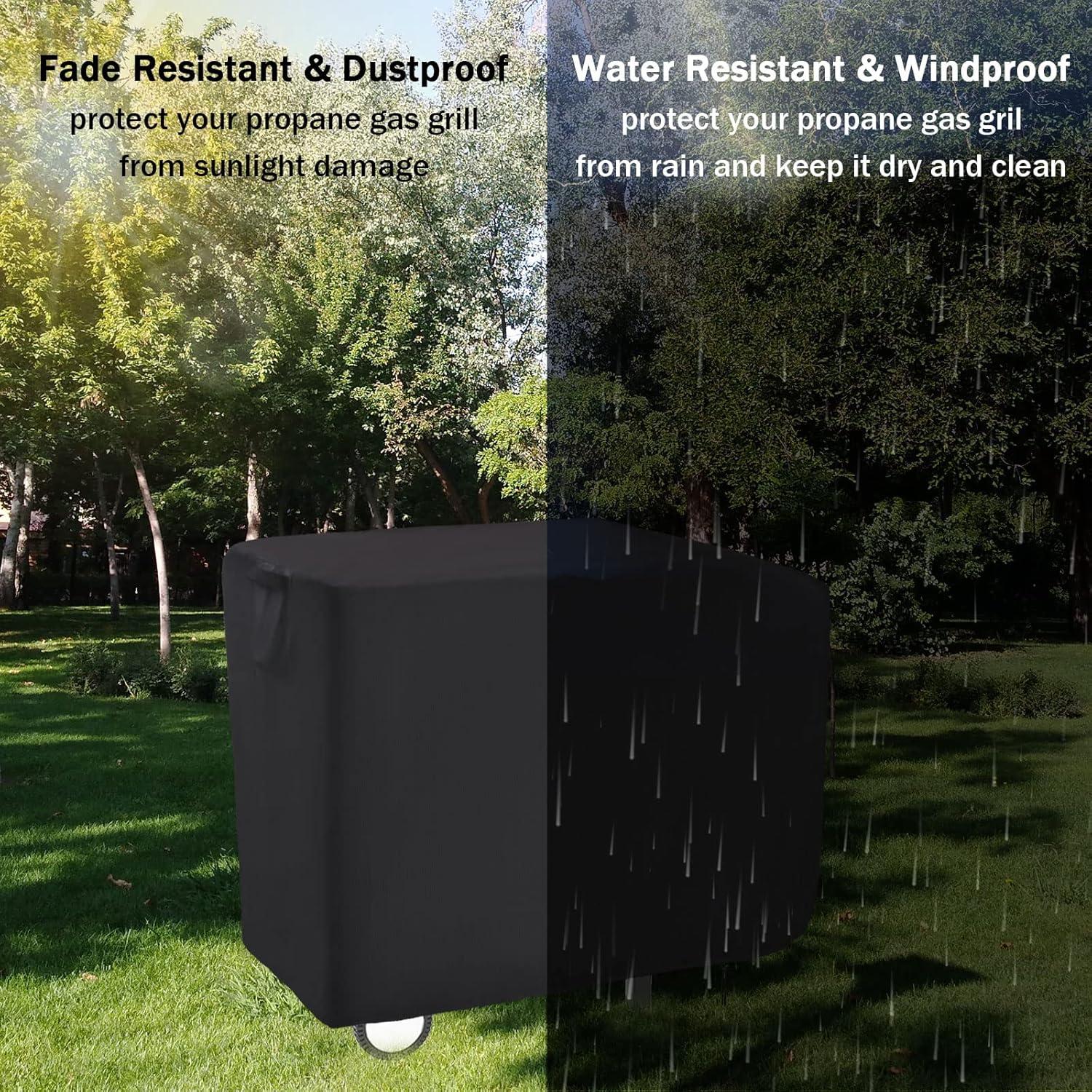 - ADJUSTABLE STRAP: The adjustble straps with buckles and drawing string at the bottom can flexibly adjust the tightness of the cover so that it can sit and stay firmly over your gas grill cover, preventing it from being blown away by the wind.