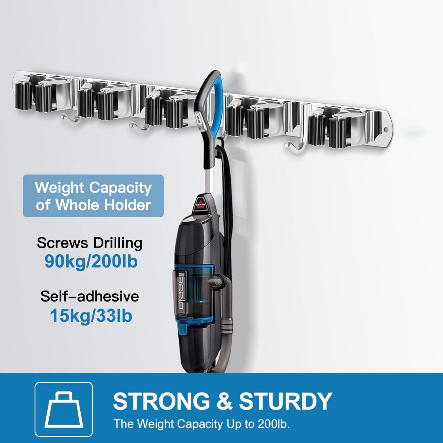 - STRONG & STURDY: Broom organizer wall mount is made of 304 stainless steel, corrosion-resistant, moisture proof and waterproof. Compared with the plastic broom rack, it's more stronger and sturdy. And this garage organization can hold up to 200 pounds when install it by screws drilling,the hook also can hold your steam mop