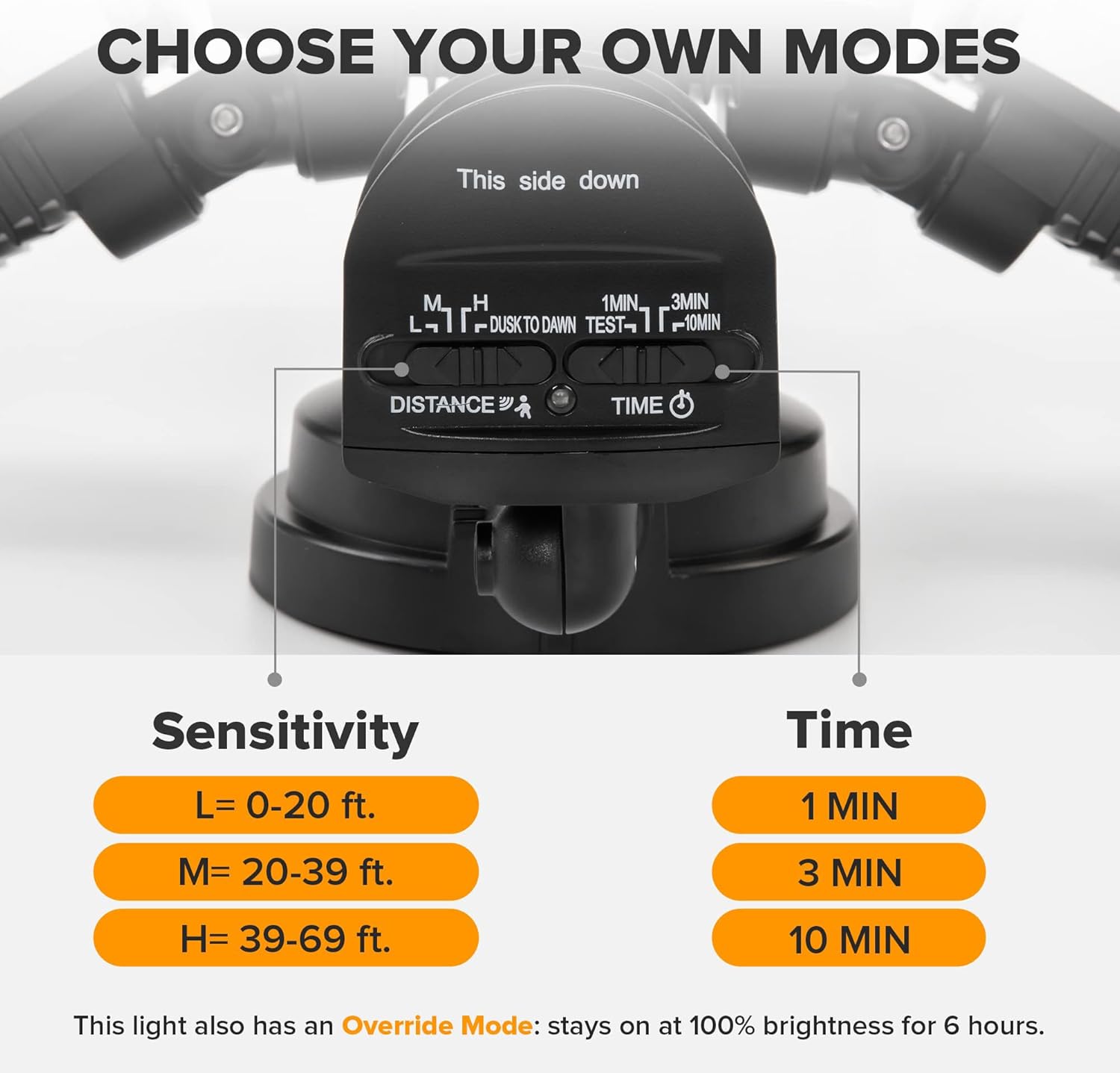 - 4 LIGHTING MODES: Test Mode, Security Mode, Dusk to Dawn Mode and Manual Override Mode. Manual override mode allows light to operate constantly for selected period of time. Deactivates during daylight hours. More choices can meet different demands for each customer. Choose the most appropriate mode for your needs.
