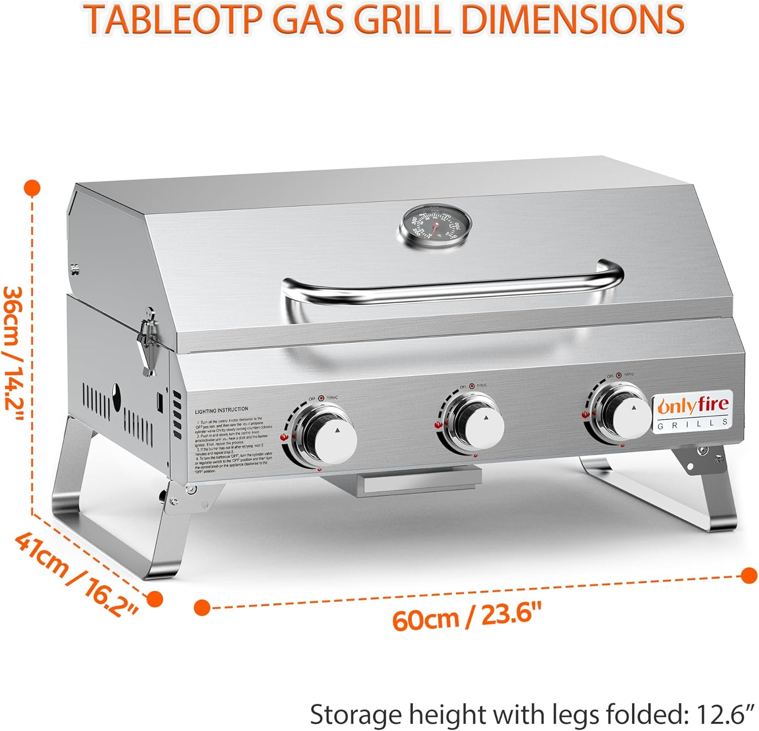 - PORTABLE WITH FOLDABLE LEGS: The heavy duty portable propane grill measures 16.2"D x 23.6"W x 14.2"H, and folded height 12" while legs are folded. This grill is designed with foldable legs which allow you to transport and store easily. The locking cover, folding legs, and carrying handle make it secured and safe for on-the-go grilling.