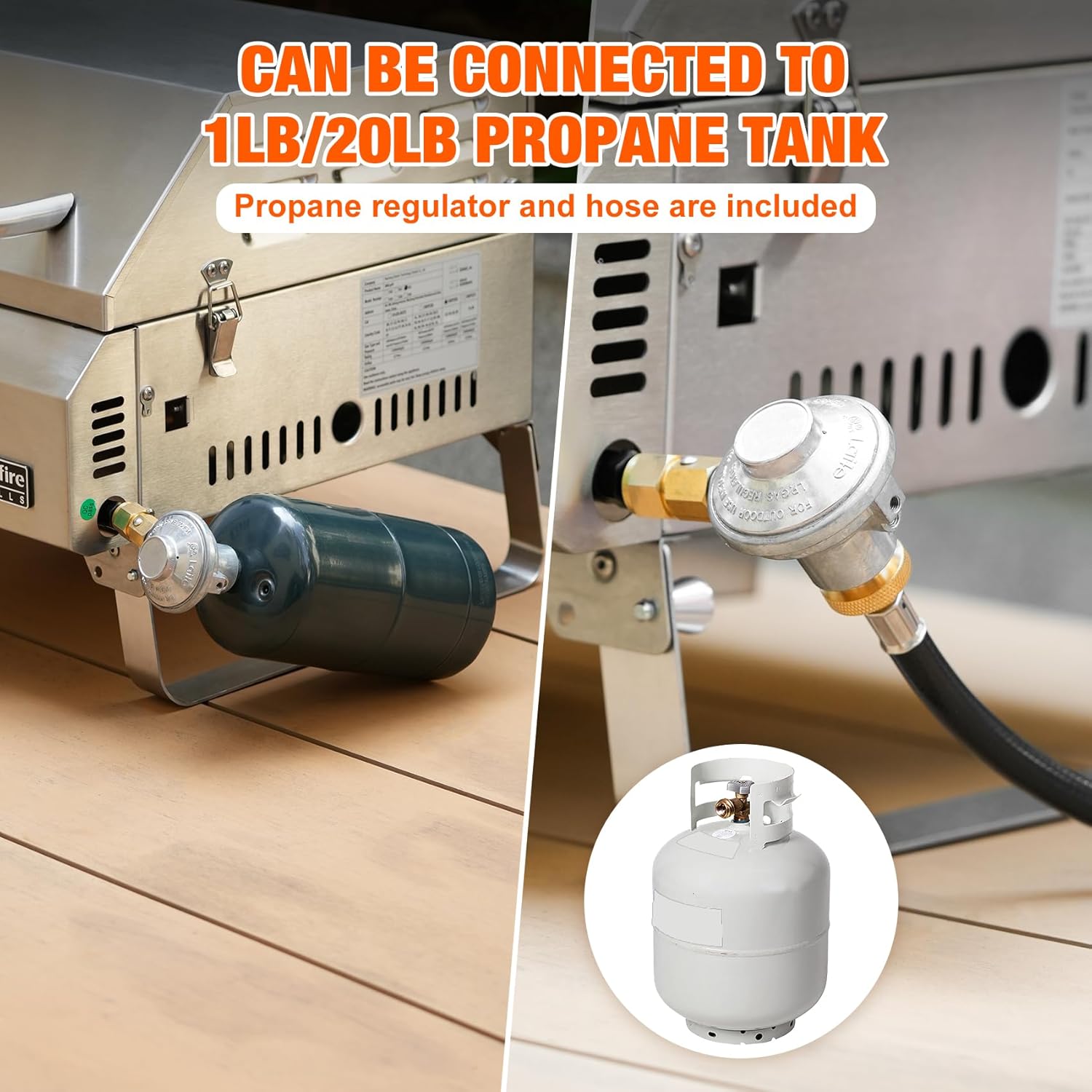 - OPTIONAL FOR 1LB OR 20LB PROPANE GAS CYLINDER: Gas valve and hose are included for both a 1lb propane cylinder and a 20lb propane tank. Easy connection with the gas and start your BBQ cooking. Removable grease tray collects food and oil drippings for easy disposal.