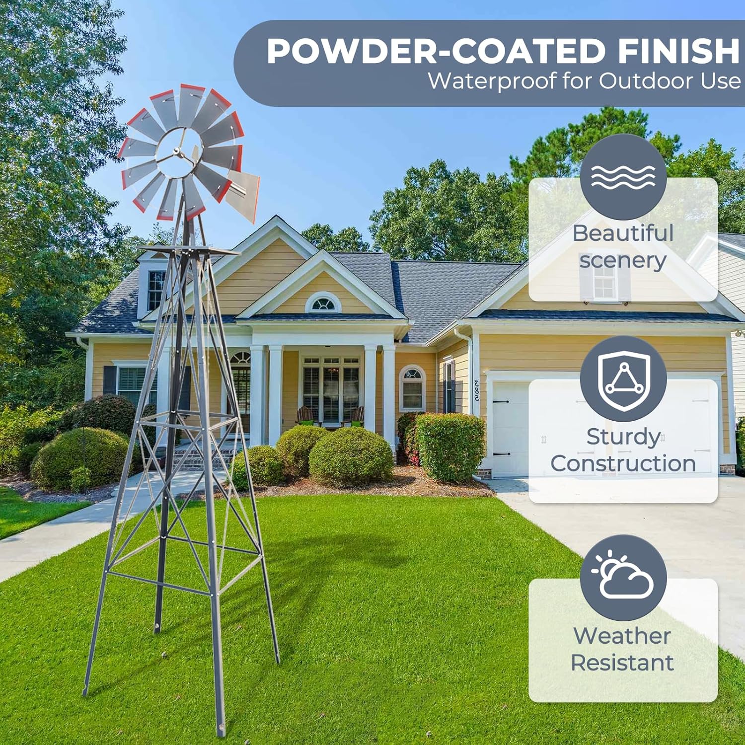 - 【SUPERIOR MATERIAL】Combined with heavy duty solid steel material, 4 metal ground stakes and high-quality hardware, our windmills have sufficient stability and safety. It's corrosion-resistant and rust-proof