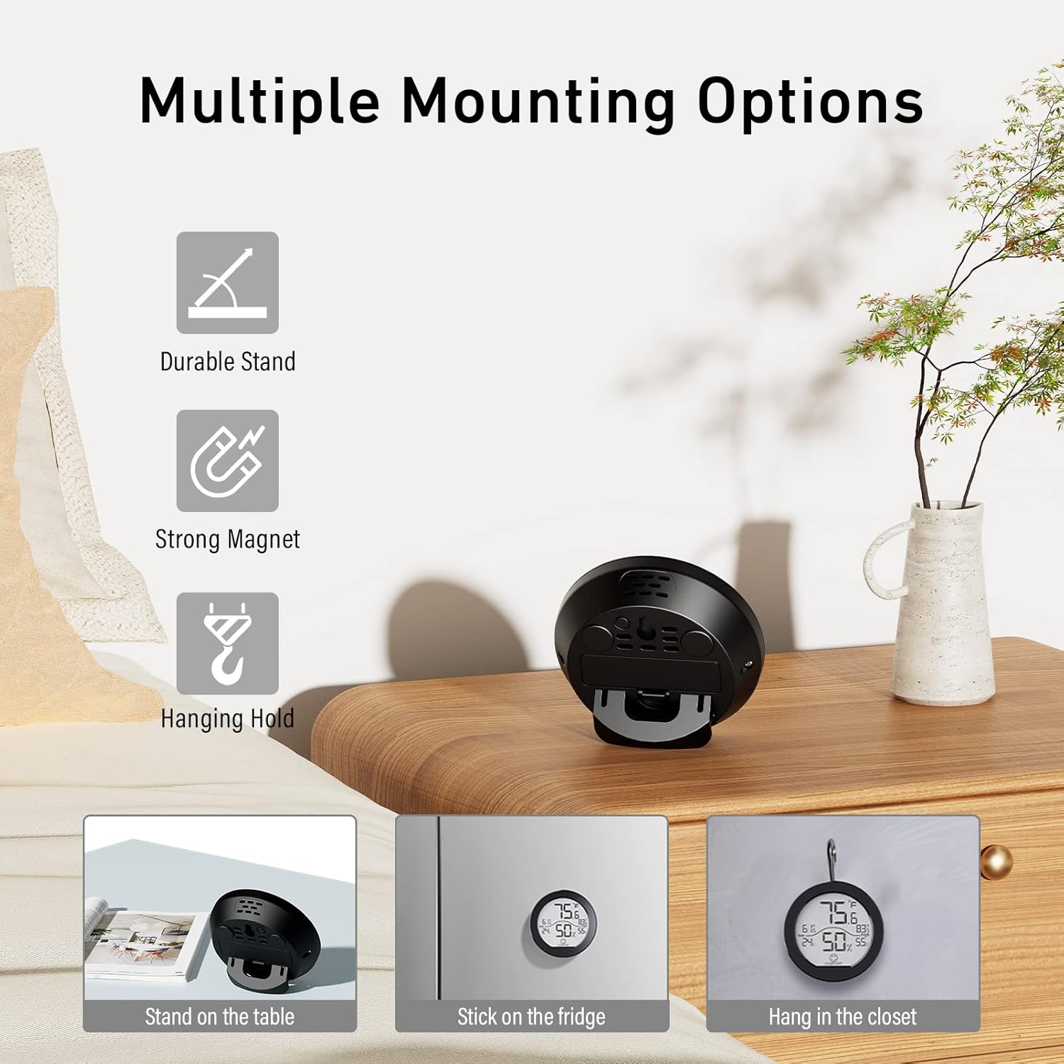 - [3 Ways to Install] Our digital humidity monitor may be mounted on a wall using a single nail, attached to the refrigerator using the built-in magnet or used on any flat surface using the stand.