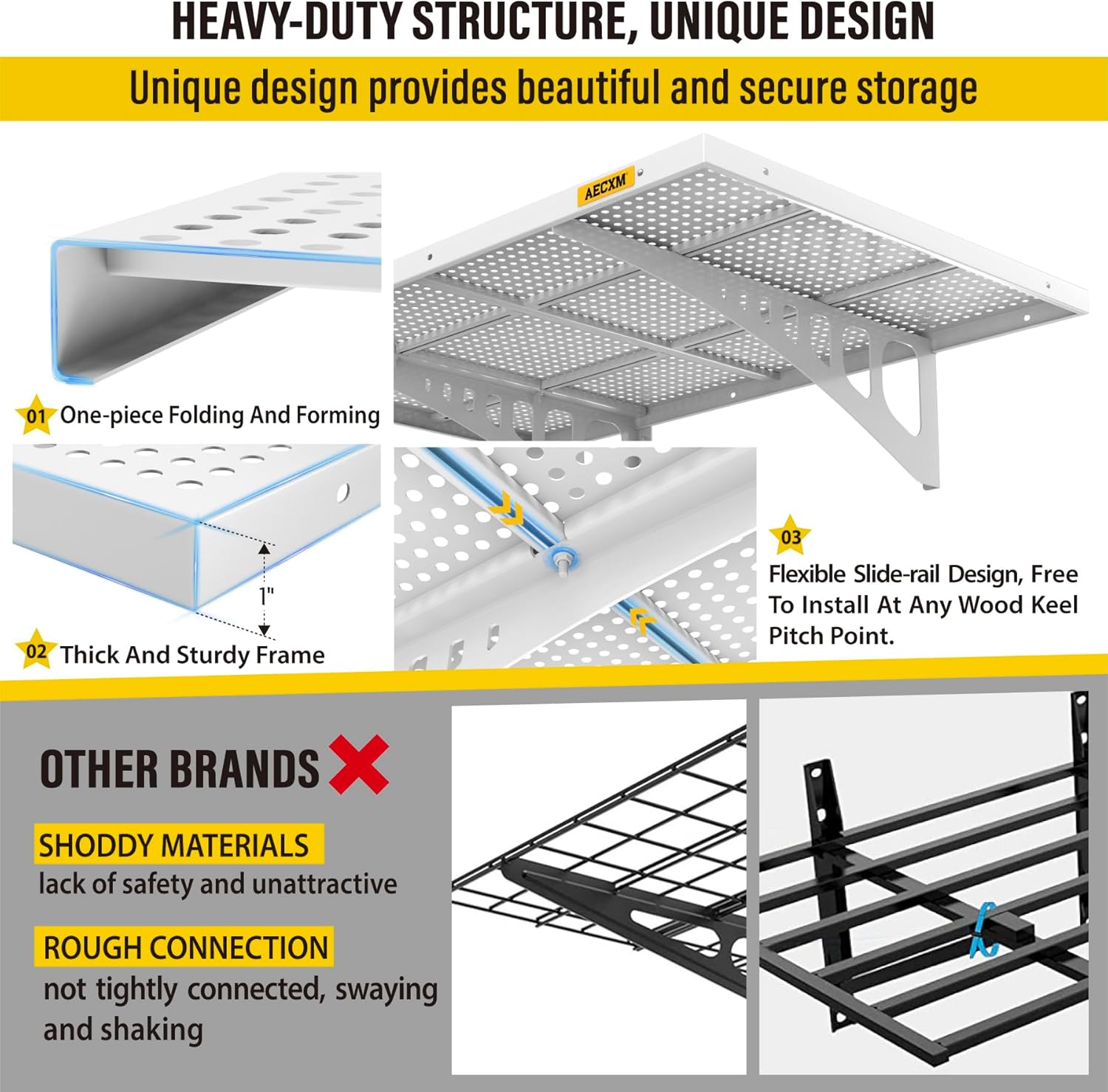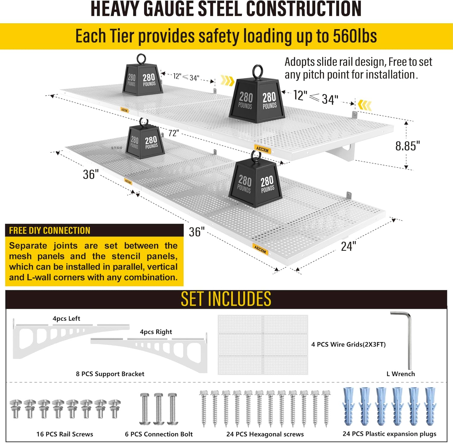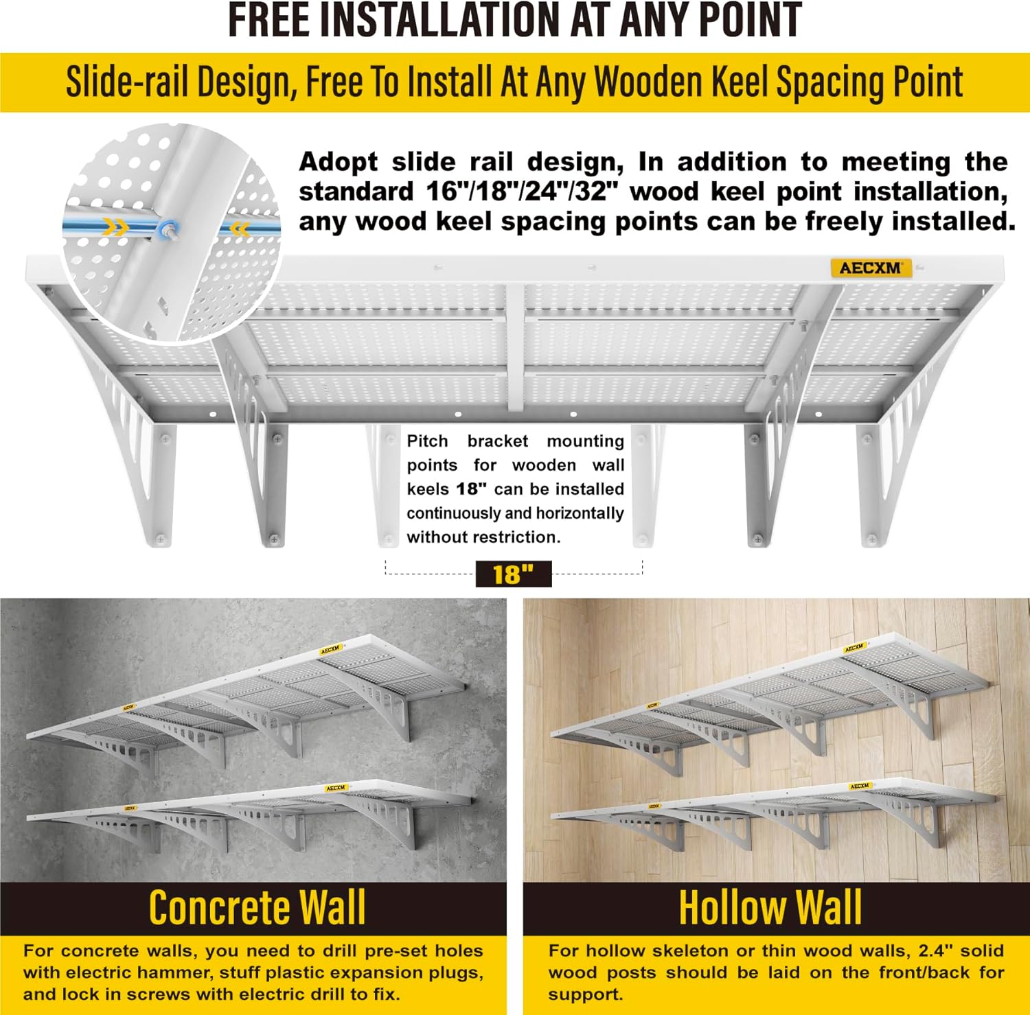- Innovative Design: Unlike fixed wood stud spacing systems, Aecxm garage wall shelving feature an exclusive sliding rail screw design, allowing flexible installation on any wood stud spacing within the panel's length. Adjust freely and hassle-free