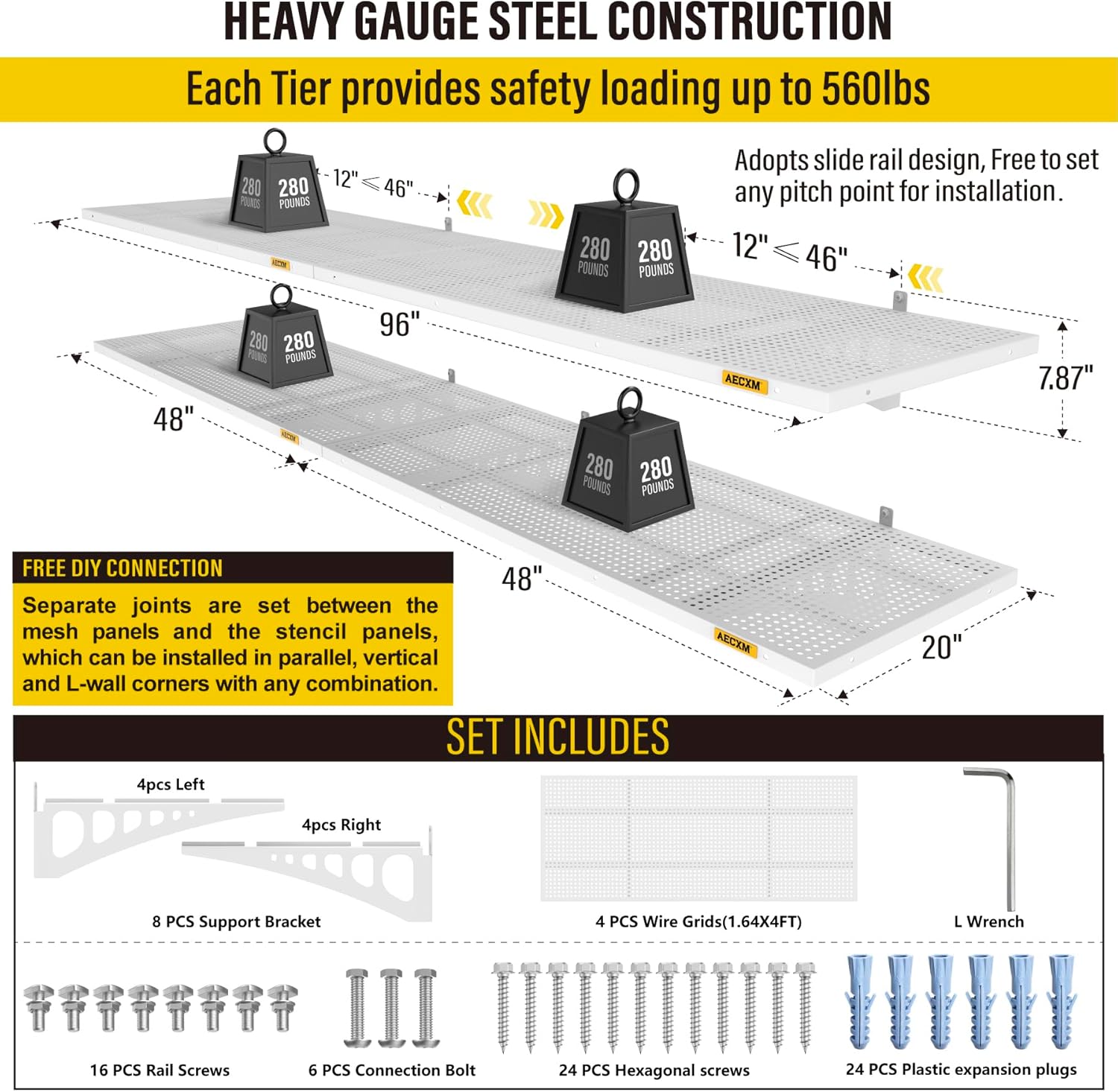 - Innovative Design: Unlike fixed wood stud spacing systems, Aecxm garage wall shelving feature an exclusive sliding rail screw design, allowing flexible installation on any wood stud spacing within the panel's length. Adjust freely and hassle-free
