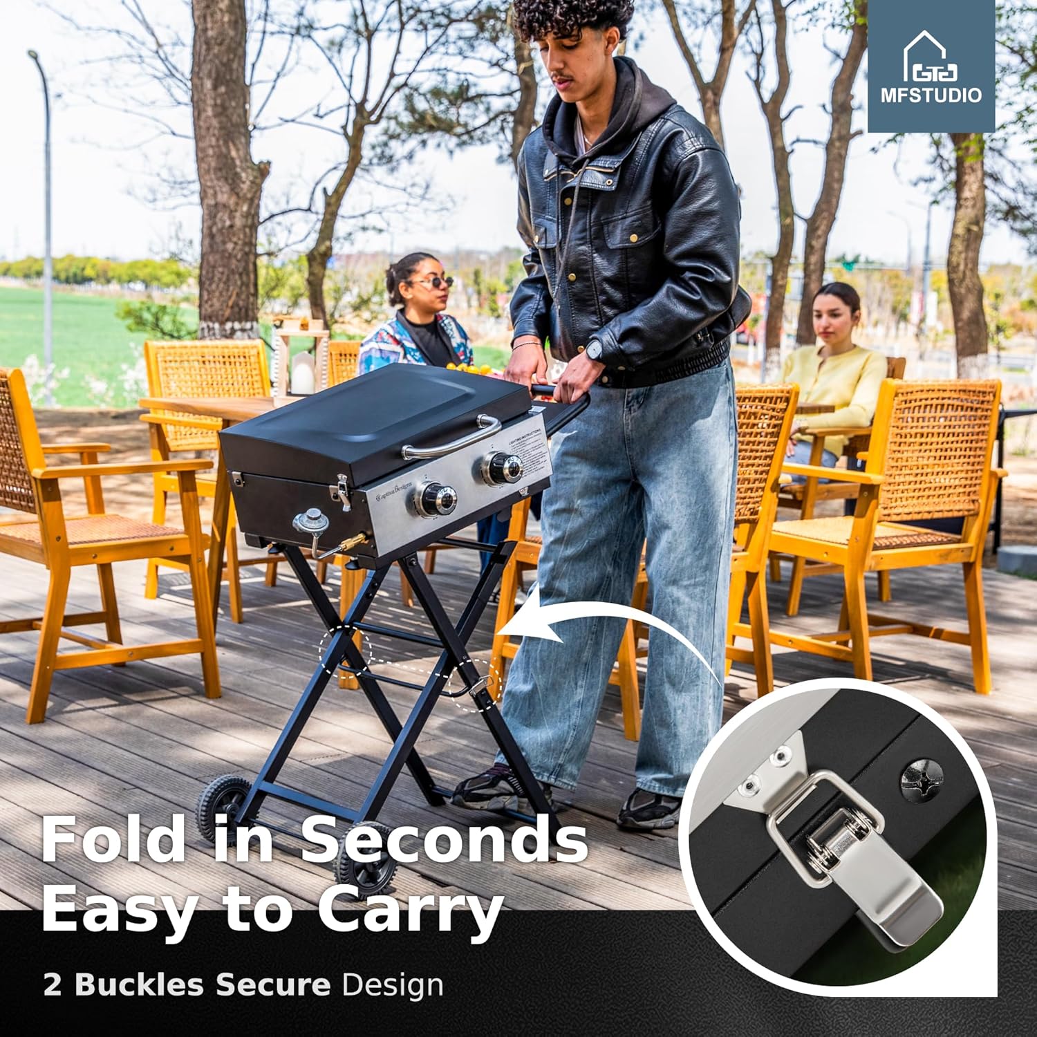 MFSTUDIO Small Portable Propane Griddle, 2 In 1 Gas BBQ Travel Grill with Foldable Stand, Compact and Light Countertop Grills with 2 Burners and Side Table, for Outdoor Cooking, Camping and Roadtrip