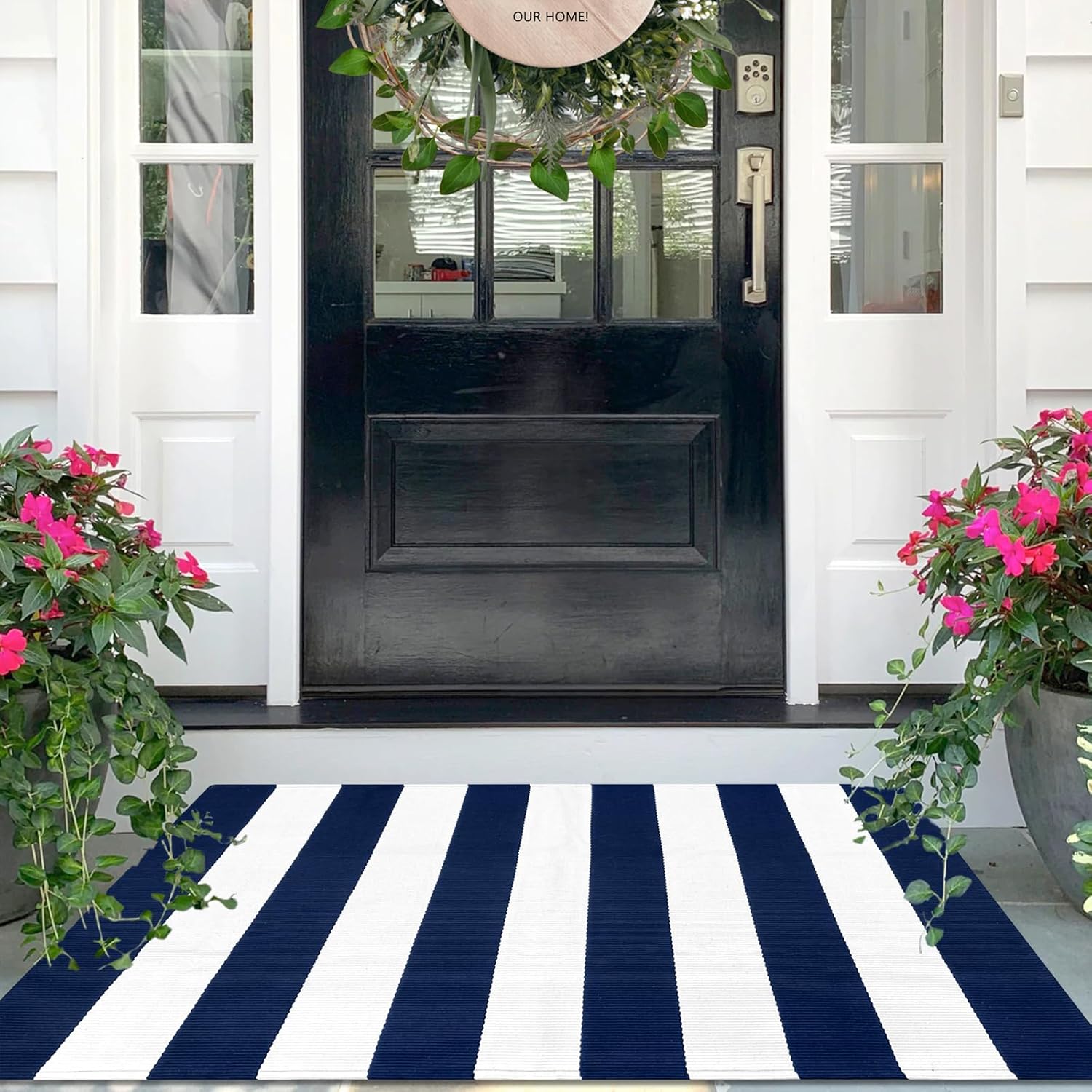 IOHOUZE Navy White Striped Rug -3x5 Front Door Mats Outdoor,Washable Rug for Front Porch Decor,Spring Summer Welcome Mats Outdoor Indoor, Doormat for Farmhouse/Entryway/Home Entrance