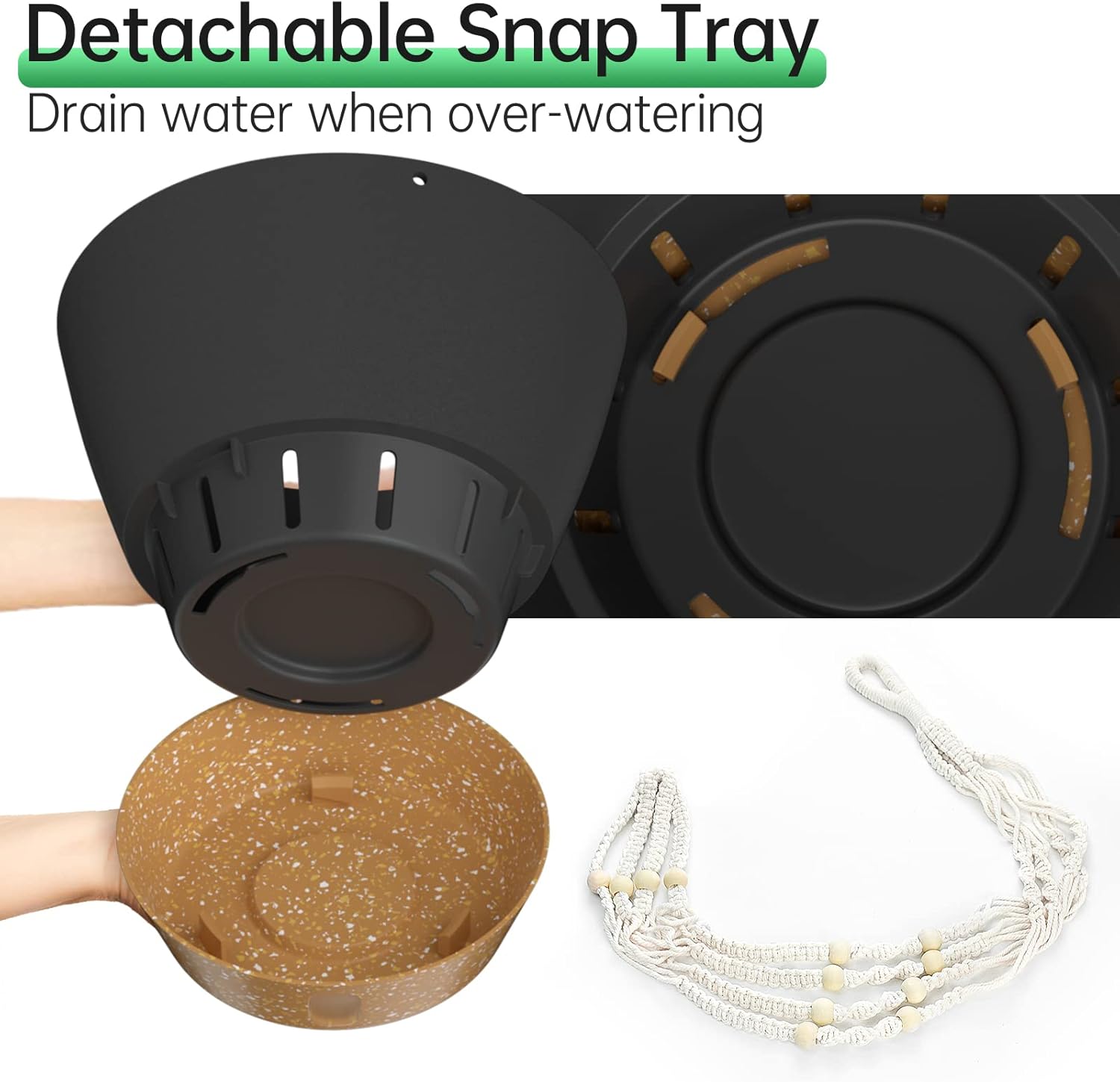 - Snap-in Tray with Visible Water Level: The tray can be removed for easy cleaning of the flower pot. The self-watering flower pot with drainage holes can drain excess water to the tray, so the tray will store an amount of water for the plant(Longer than 7 days). And you can water the plants by looking at the water level.