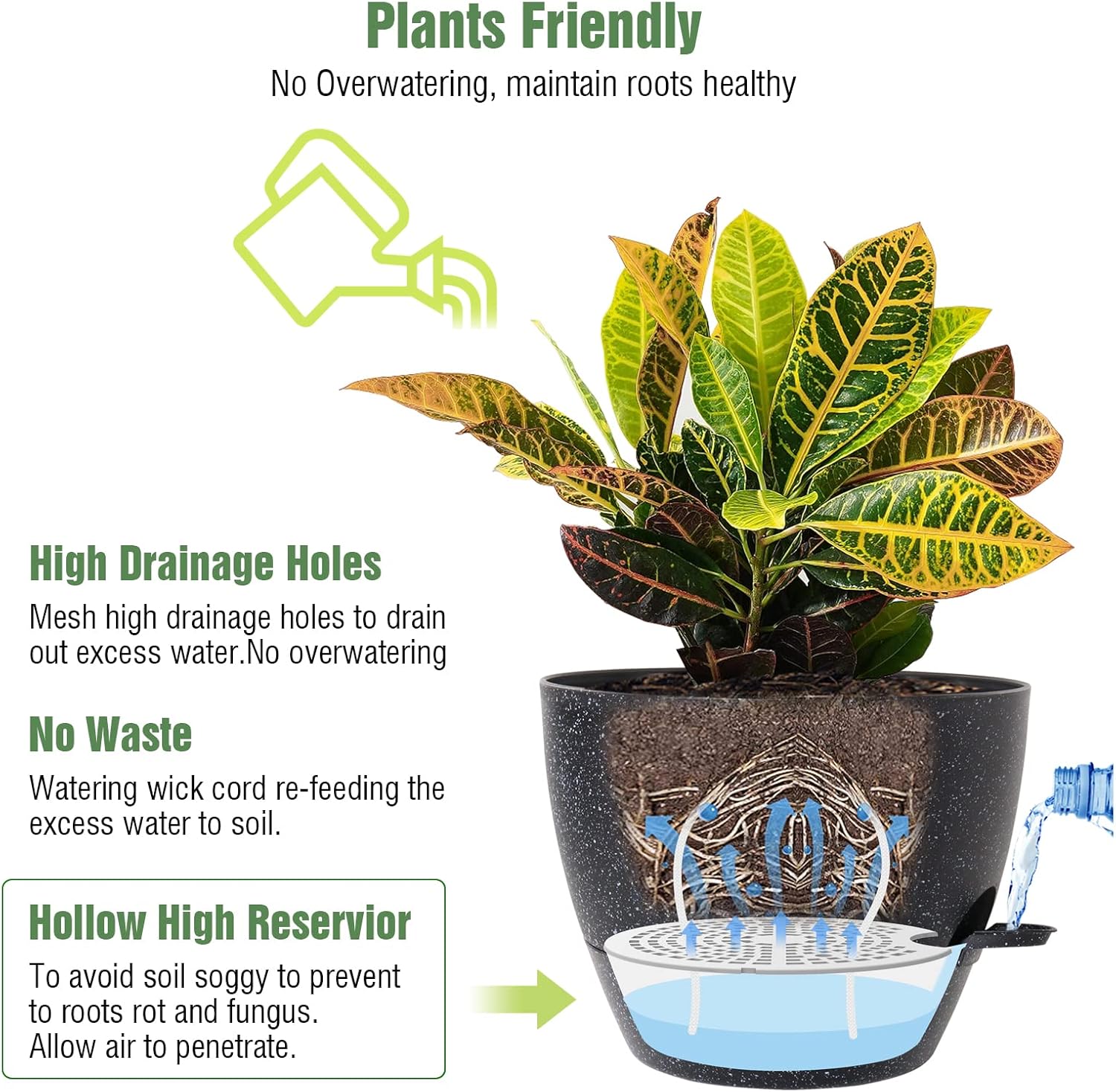 10/9/8 inch Self Watering Pots, Set of 3 Plastic Planters with Mesh Drainage Holes and Deep Reservoir for Indoor Outdoor Garden Plants and Flowers, Black Speckles