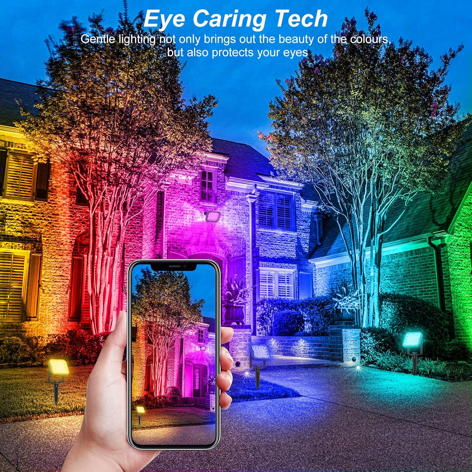 - 【2 Lighting Modes】 This color changing solar spotlights has 2 lighting modes, six-colour change mode and single-colour fixed-colour mode (with memory function, this function fails when the battery is dead). Automatic switch-on at night and automatic switch-off at sunrise by light-sensing control.