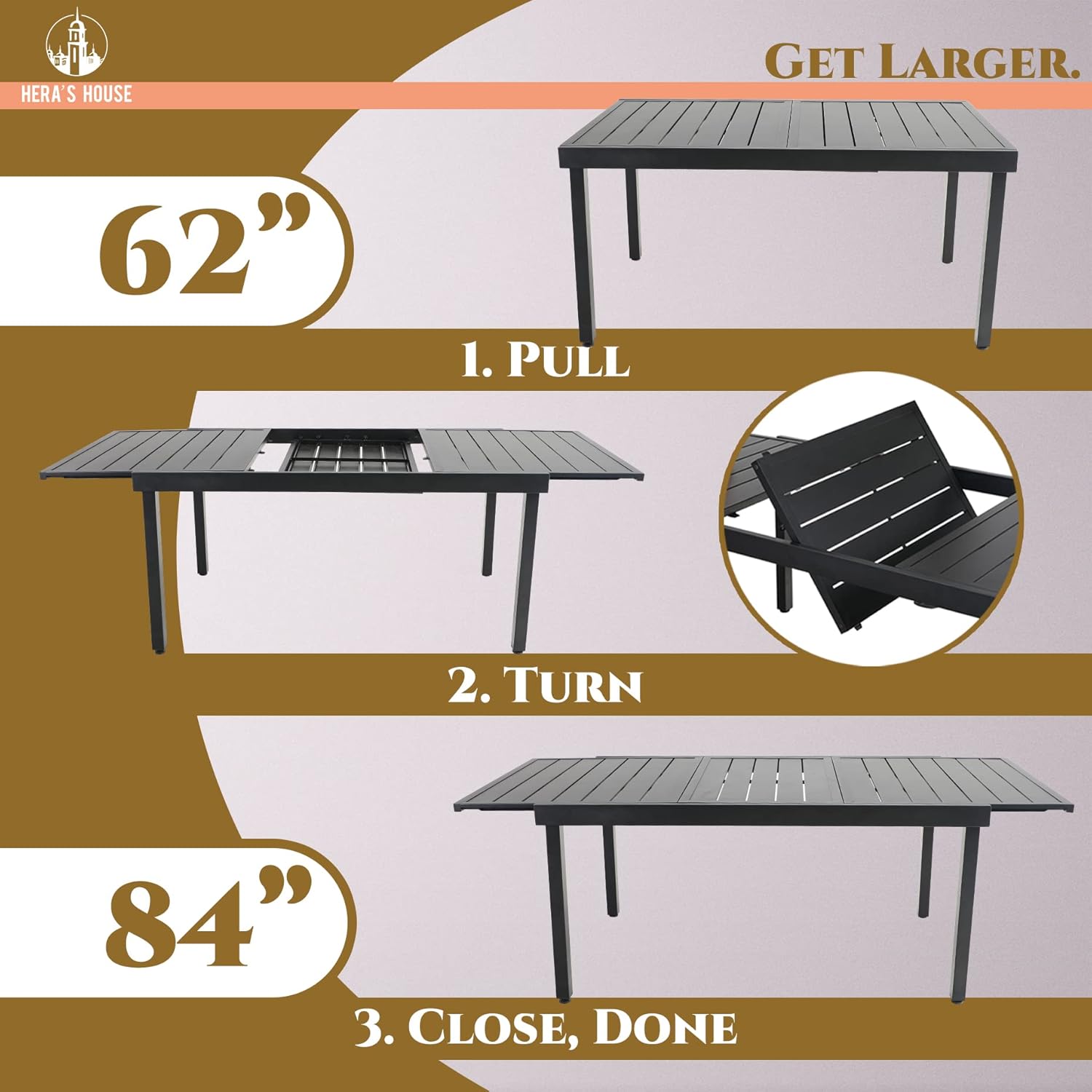 - ă62"/84" MORDEN EXTENDABLE SLATTED METAL TABLE TOPăLarge rectangle surface for 6-8 person, enough space for your leisure time with your friends or family. HERAâS HOUSE slatted metal table top leaves enough water seepage gaps, which is easy to clean and wonât accumulate water. Expandable table top with 2 sizes (62" and 84") meet your actual needs.