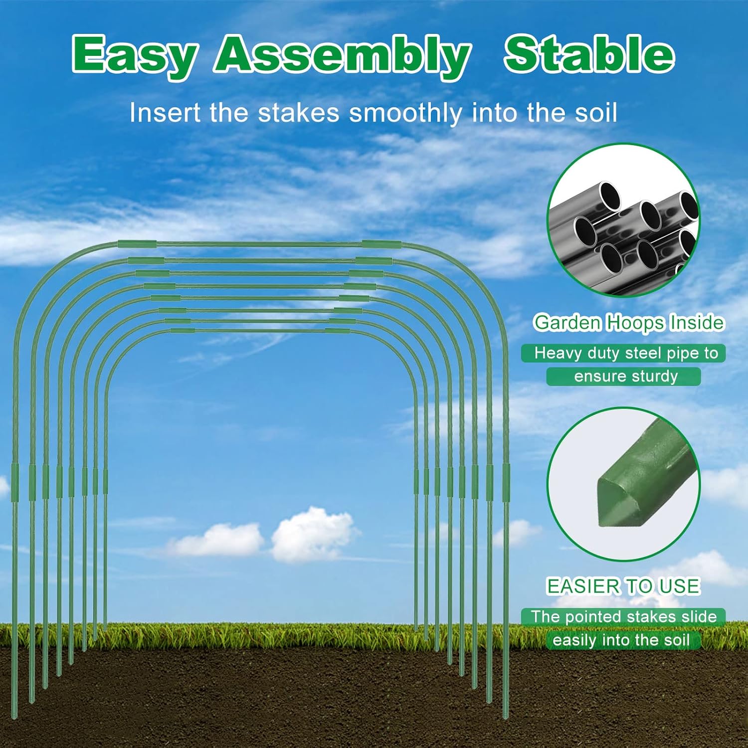 - 🌱【Garden hoops for Raised Bed】 : Greenhouse Hoops frame widely used indoors and outdoors, great for the yard, vegetable garden, and garden raised beds. DIY Garden Hoops Grow Tunnel Kit works well to protect your plants, seedlings, herbs flowers,strawberry in any season gardening plant.Plant support for climbing plants,plant stakes for outdoor plants,Tomato support garden stakes.