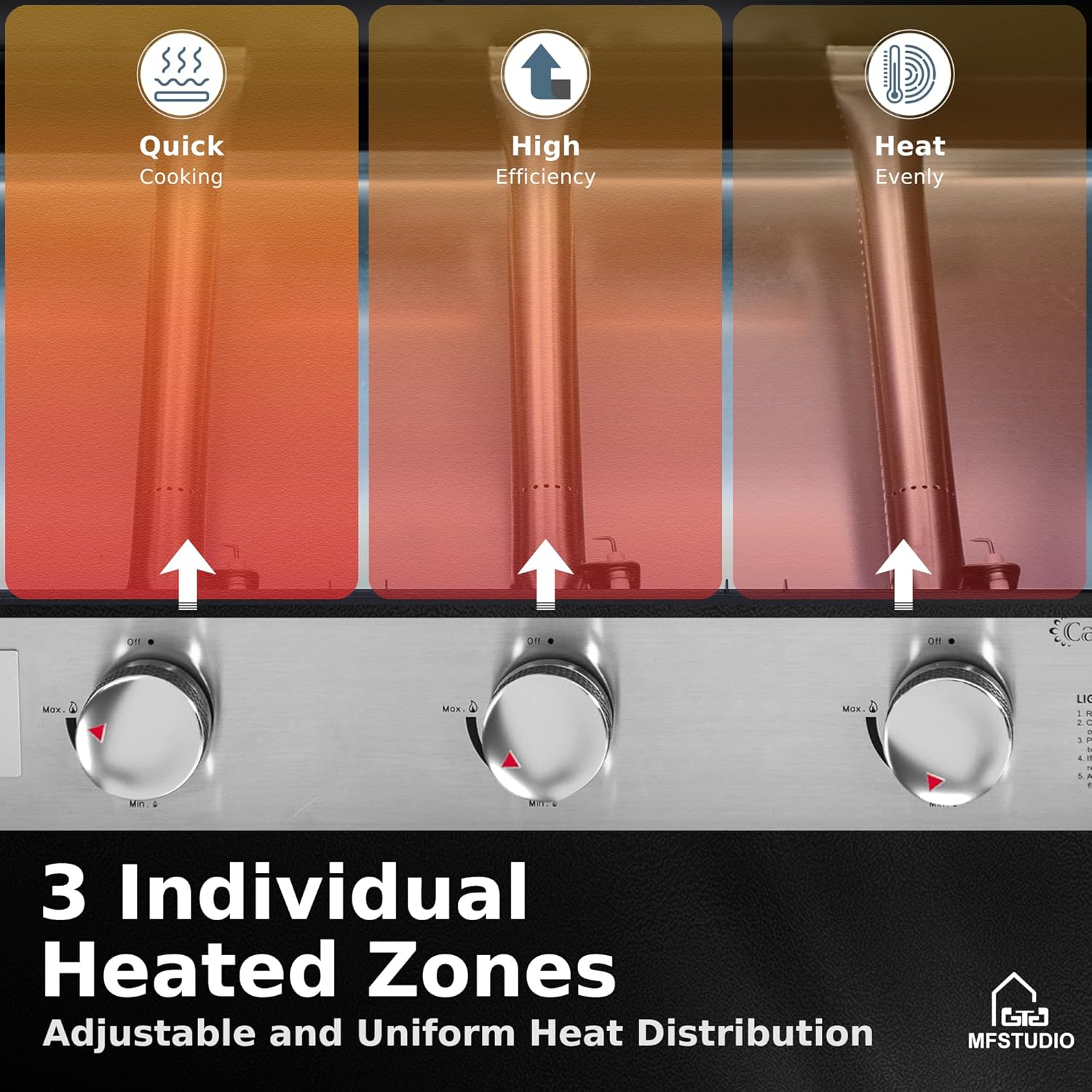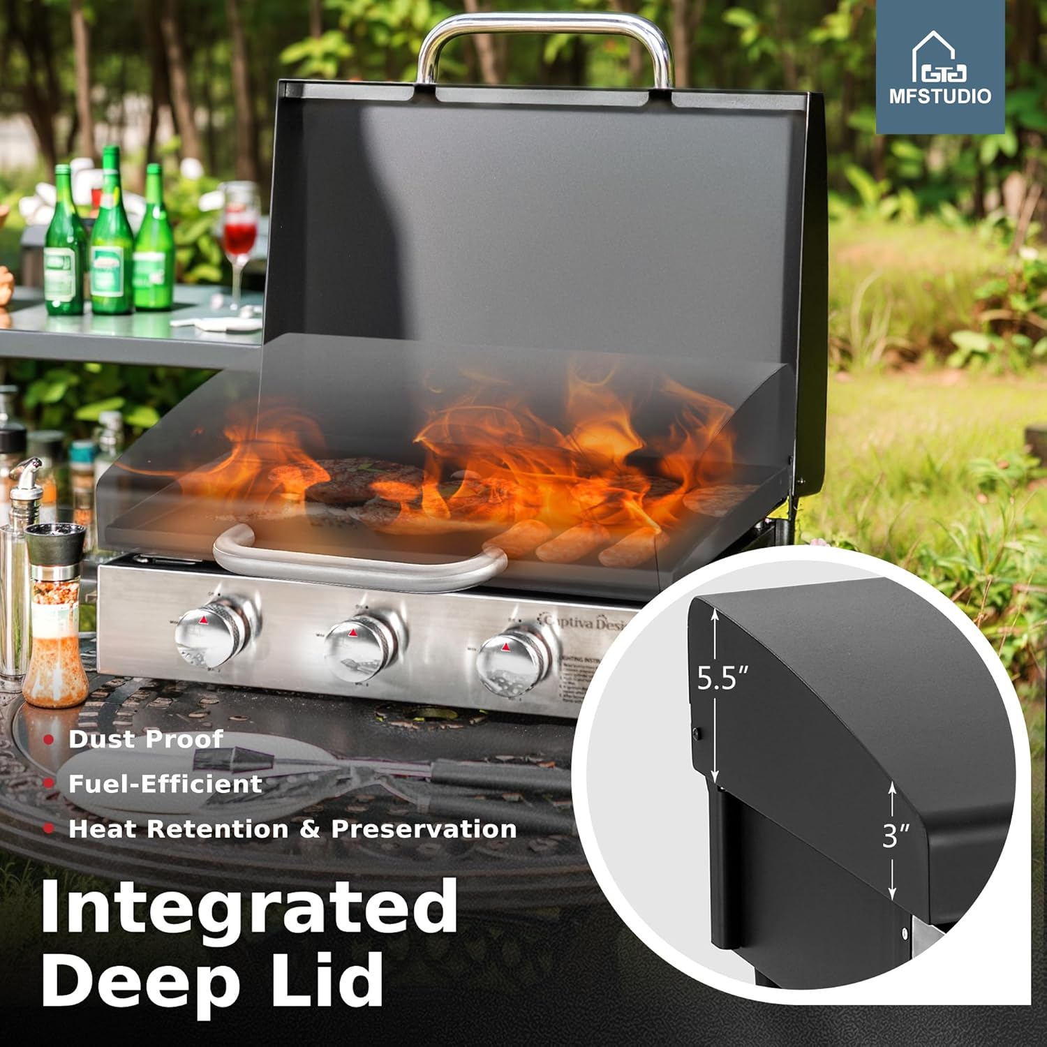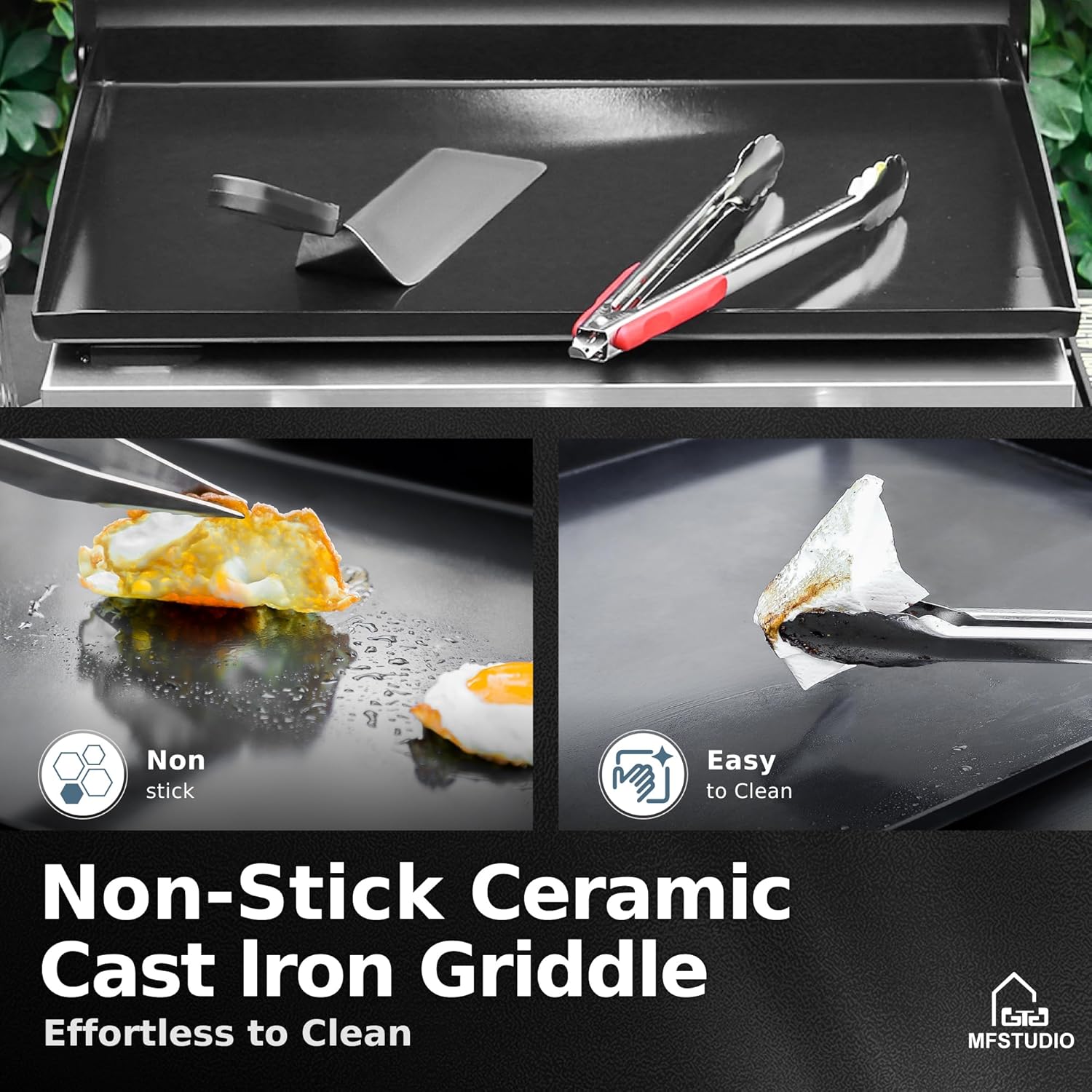 MFSTUDIO 22 Inch Flat Top Grill with Ceramic Coated Cast Iron Pan, 3 Burners Portable Tabletop Propane Gas Griddle Grill for Camping, Outdoor & Tailgating Barbecue, 24,000 BTU