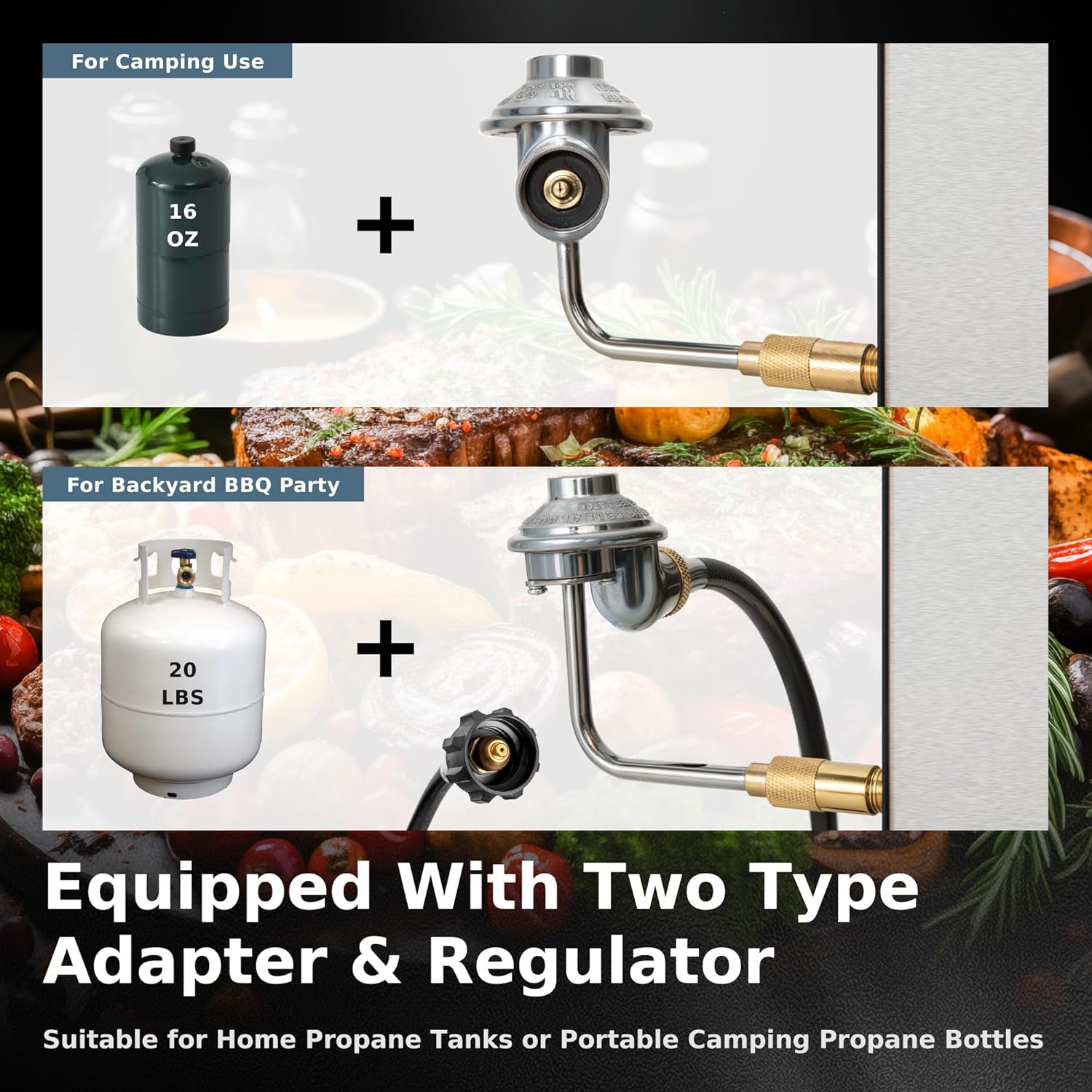 - Portable Table Top Griddle: It can be connected to a 20 LBS propane tank or a 1 LB cylinder, so it can be used for a backyard BBQ or a camping grill
