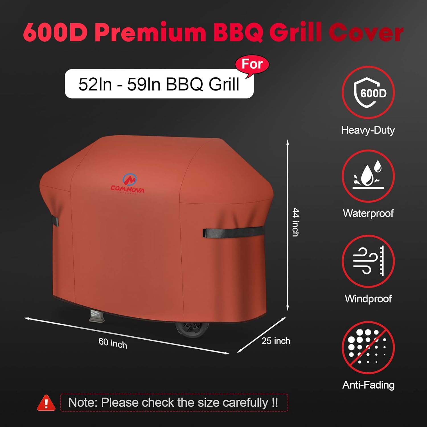 - | 60 Inch Grill Cover Fit Map | - Measures: 60" width x 25" depth x 44" height, Comnova 60 inch grill covers are perfectly compatible with most 3 to 5 burner grills with widths between 53" to 59", such as Weber, Char-Broil, Nexgrill, Monument, Dyna-glo, Brinkmann and more. Please check the dimension of your grill carefully before ordering. (Not fit Weber Genesis 4-burner grills.)