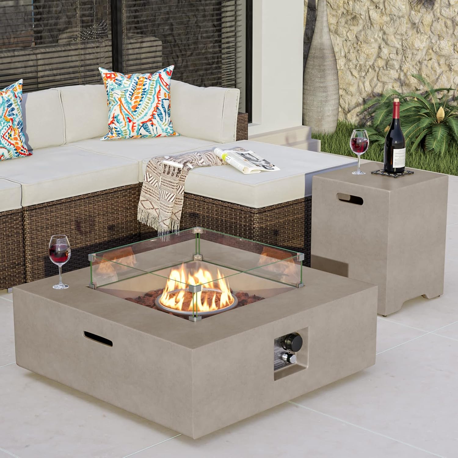 COSIEST 35-inch Square Outdoor Sandstone Propane Fire Pit w Wind Guard and Side Table, CSA Certified, 50,000 BTU Stainless Steel Burner, Free Lava Rocks and Rain Cover, Metal Lid(Gray)