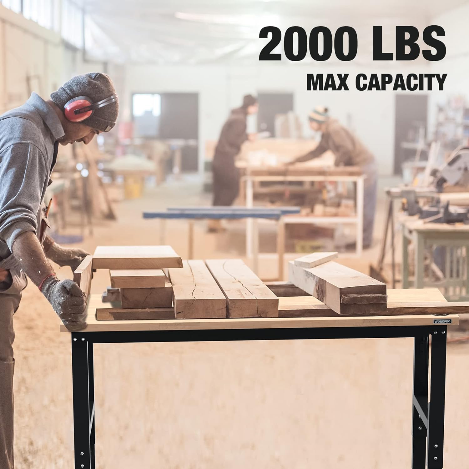 WORKPRO 60" Adjustable Workbench, Rubber Wood Top Heavy-Duty Workstation, 2000 LBS Load Capacity Hardwood Worktable with Power Outlets, for Workshop, Garage, Pack of 10