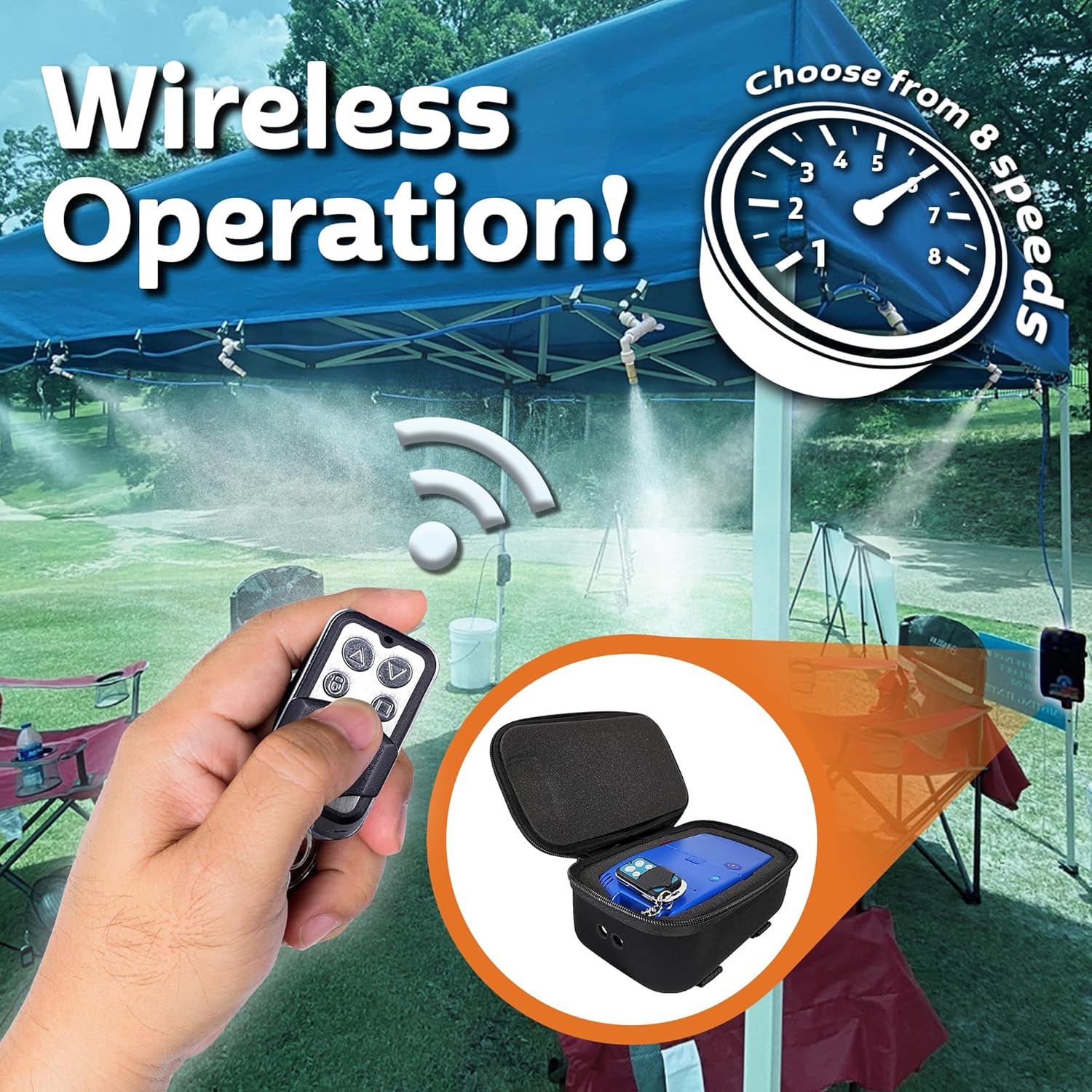 - šššššššššš šššššššš - Perfect for situations where a/c outlets and garden hoses are not an option, the Quad kit features a convenient wireless remote! Simply insert the 4 ft. feed (1.2 m) hose into any clean water source, set the speed and enjoy the cooling mist! A single charge lasts approximately 5-12 hours of refreshing mist with each use.
