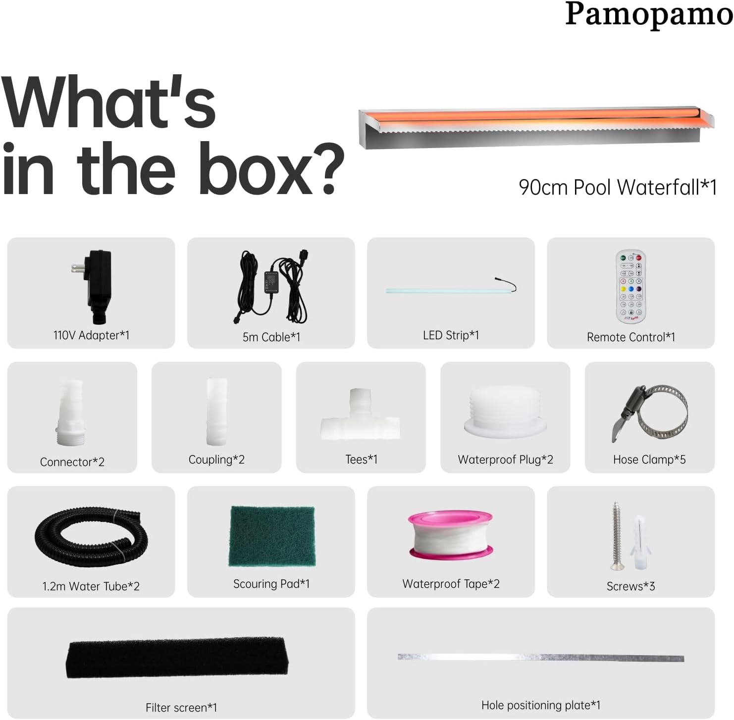 - ⏩Decoration Pool Waterfall⏪ Pamopamo waterfall spillway makes your garden swimming pool and koi pond elegant, fashionable and beautiful. The color change of LED lights and the gentle sound of water running make your patio more special at night.