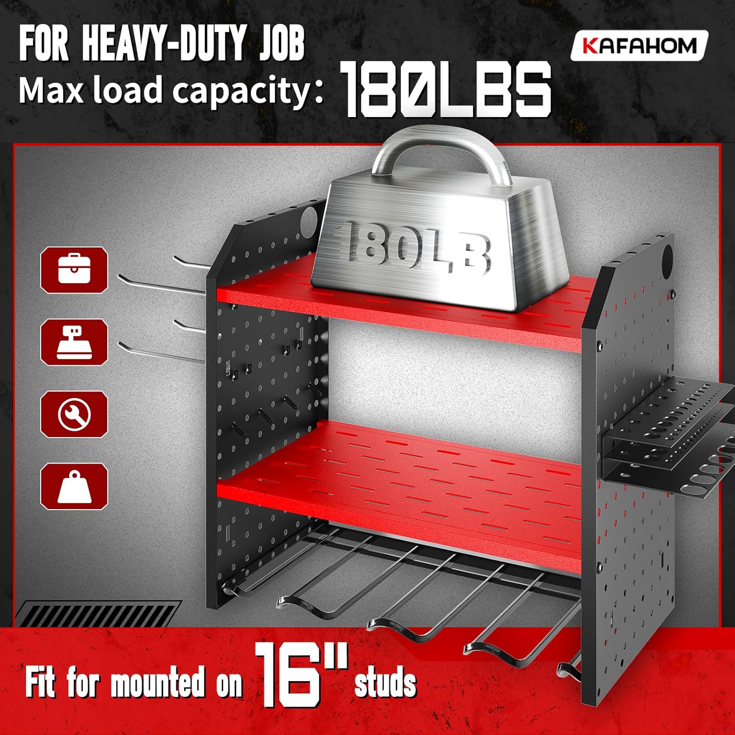 - BONUS FEATURE: The design of the space doesn't stop there. The sides are also something we didn't miss.The garage wall shelving comes with an additional side tray attached to the side pegboard that can hold a maximum of 30 drill bits, 7 pliers, and 7 screwdrivers. There are 4 long hooks and 8 curved hooks that can also help you with hanging jobs. Kids' hazard warning: Keep it away from little ones.Amazing christmas or father's day gift for men.