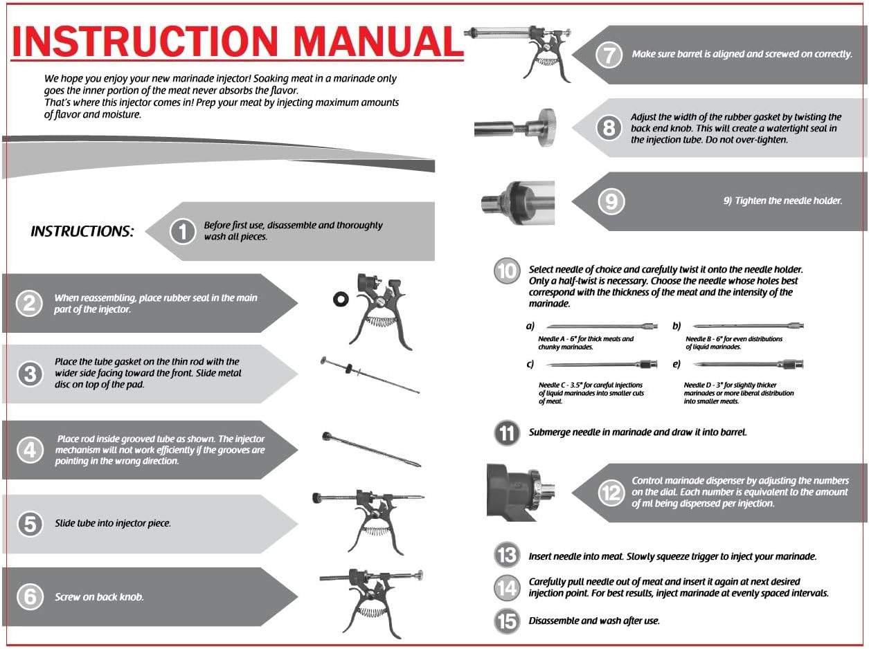 - PROFESSIONAL QUALITY & DURABILITY: No Glass tube that will break easy in this Meat Injector Gun Kit. Step up your game with our superior meat injector gun. Crafted from High-Quality Stainless Steel and easy to use together with the Instructions Manual, this will ensure that you are getting the most cutting-edge meat injector on the market. Easy cleaning. Enjoy a bonus booklet with a variety of mouthwatering recipes made exclusively for the Professional BBQ Marinade Injector Gun.