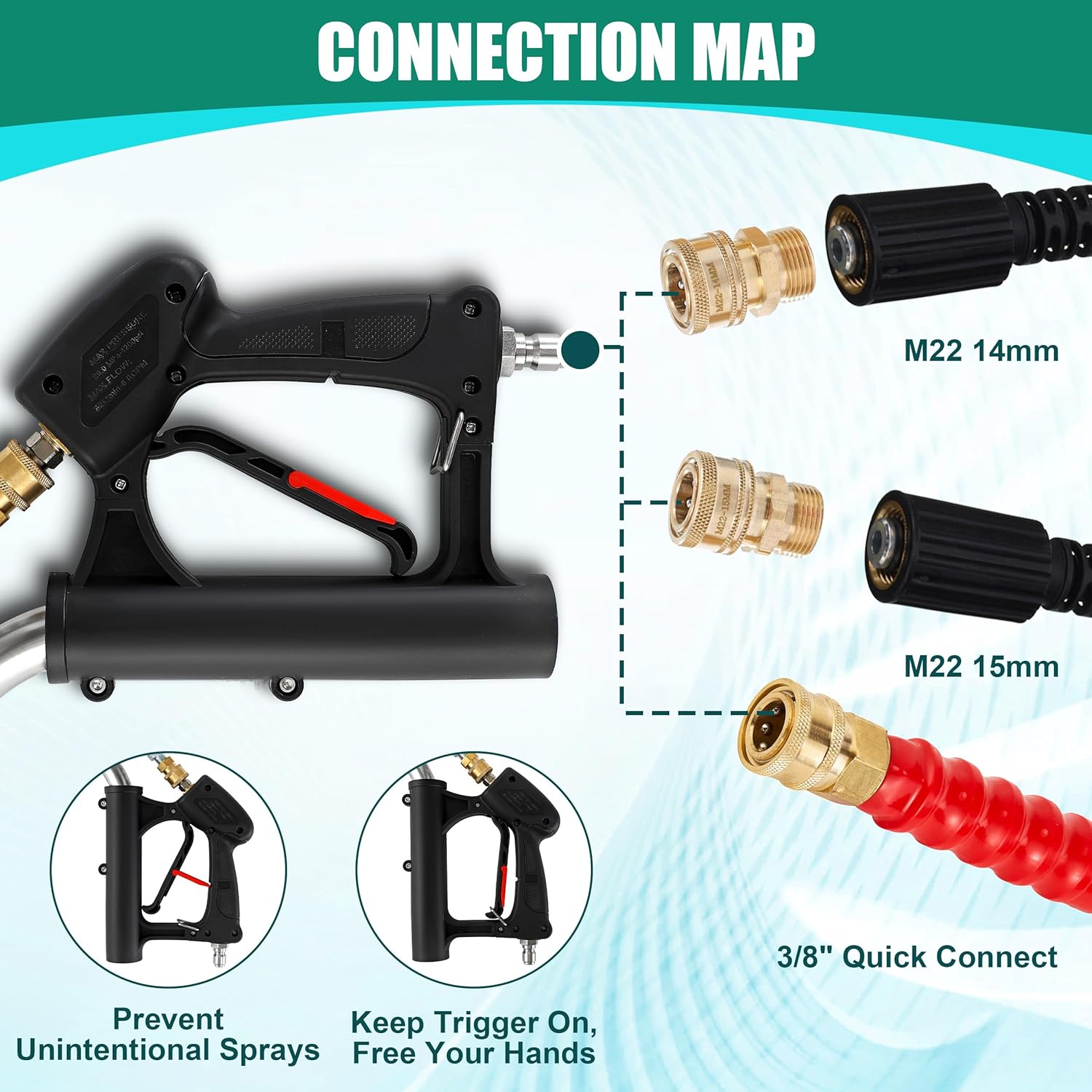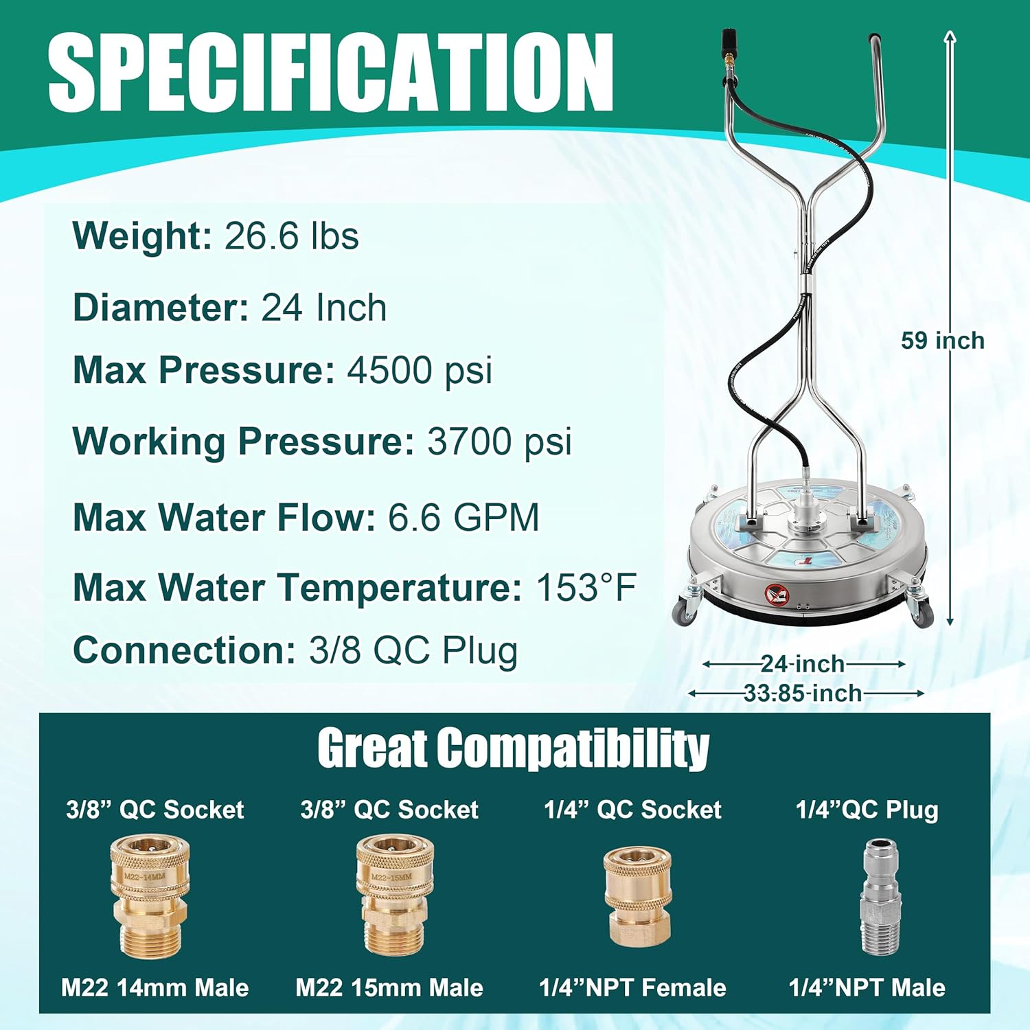 - EASY ATTACHMENT & COMPATIBILITY: The package includes 3/8" QC to M22-14 male fitting and 3/8" QC to M22-15 male fitting, making it compatible with most pressure washers on the market. Upgrade your pressure washer with this high-quality 24" stainless steel pressure washer surface cleaner.