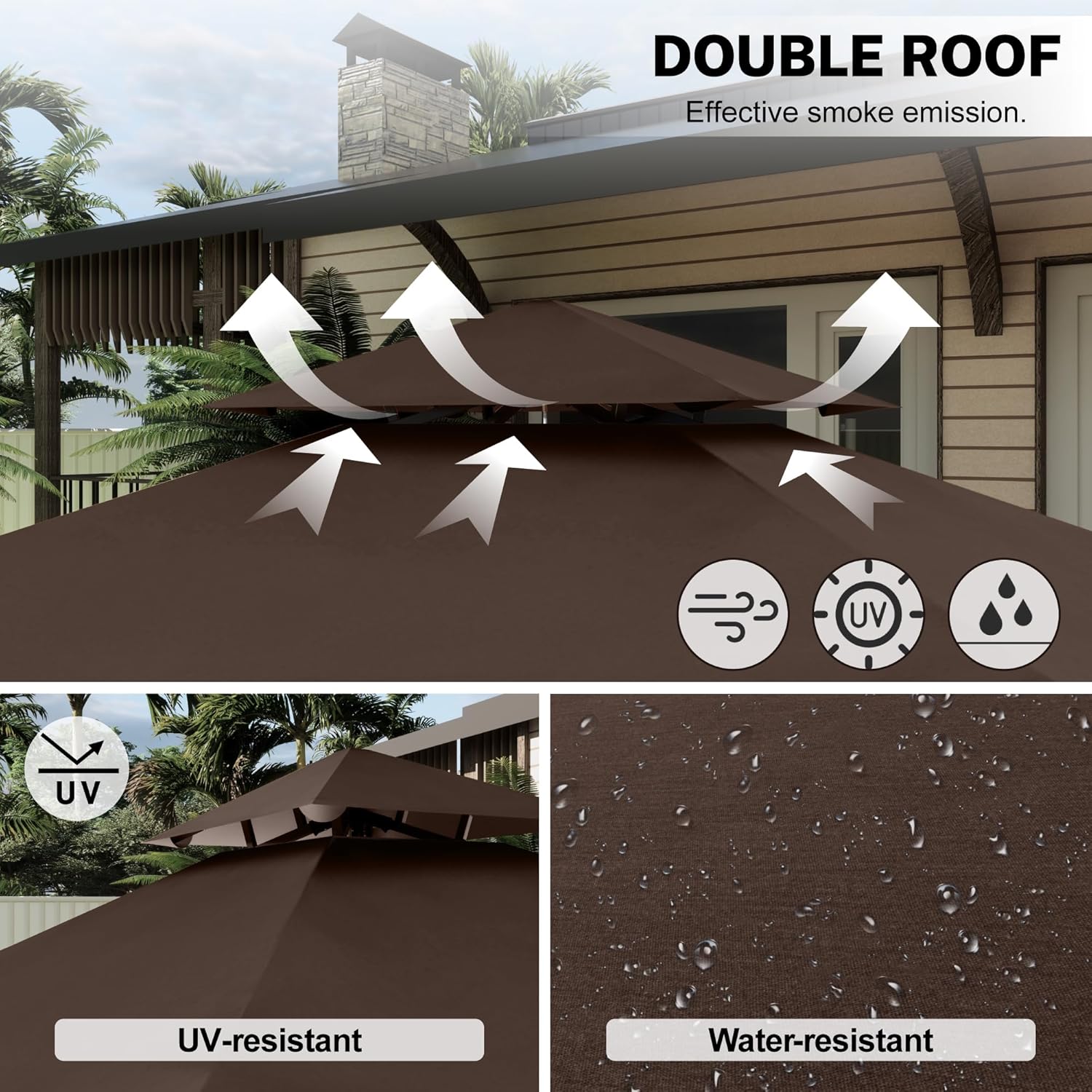 - ✅Double Roof Design: The roof is made of 50+UV material, which can effectively resist UV rays and is waterproof. The double-layer roof design can effectively exhaust the grease and smoke from the barbecue.