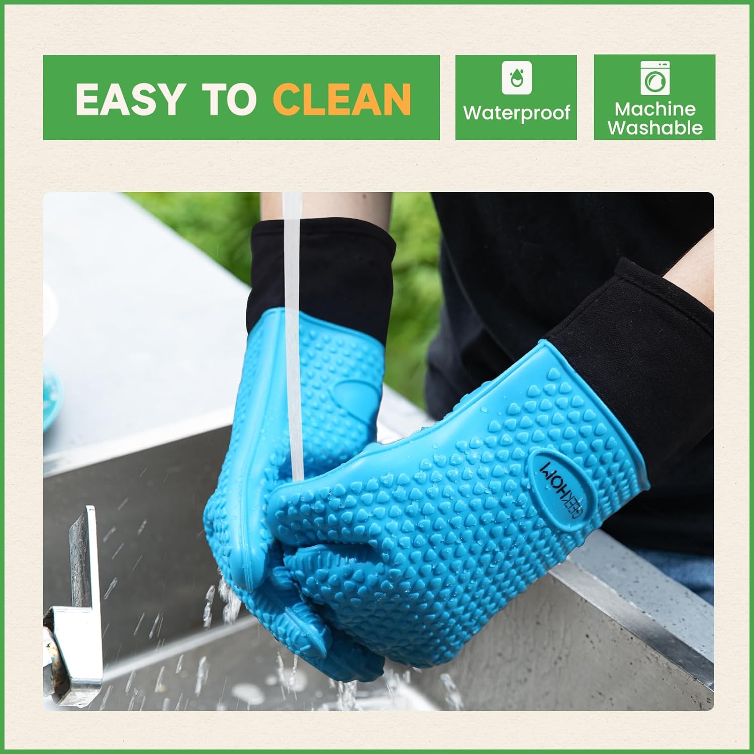 GEEKHOM BBQ Gloves, Grilling Gloves Heat Resistant Oven Gloves, Kitchen Silicone Oven Mitts, Long Waterproof Non-Slip Pot Holder for Barbecue, Cooking, Baking, Aqua Blue
