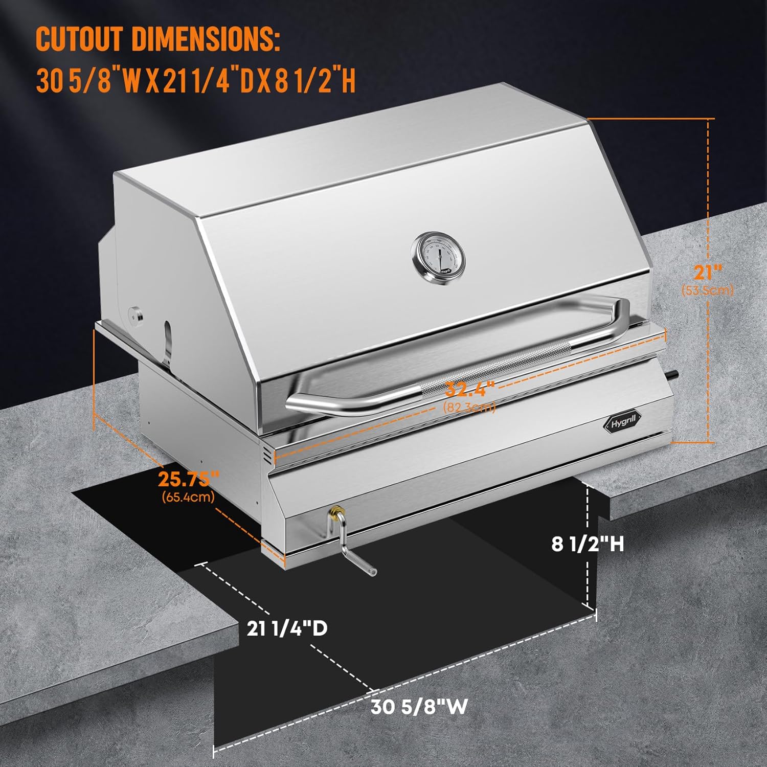 Hygrill Charcoal Grill Head for Outdoor Kitchen, 32-inch Stainless Steel Built-In Grill with Insulated Hood, Temperature Gauge and Fabric Cover