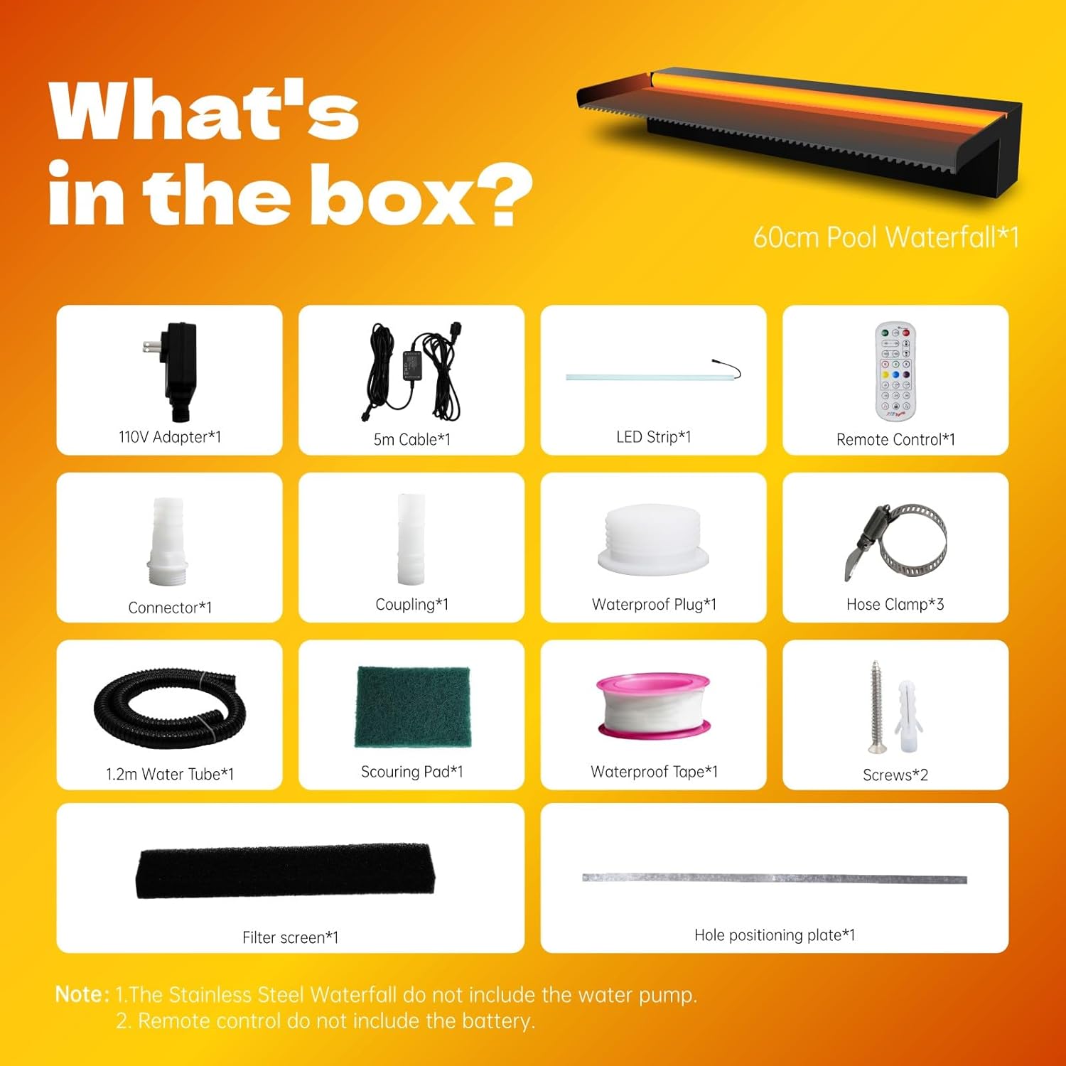 - ⏩Decoration Pool Waterfall⏪ Pamopamo waterfall spillway makes your garden swimming pool and koi pond elegant, fashionable and beautiful. The color change of LED lights and the gentle sound of water running make your patio more special at night.