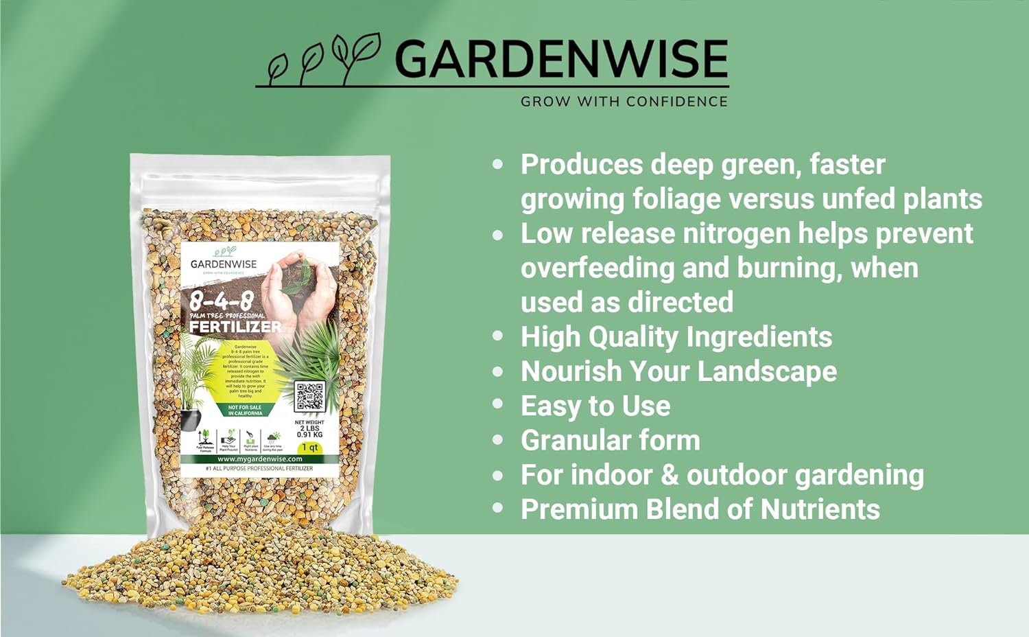 - π΄ Optimal Nutrition for Palm Trees: With a balance of 8% nitrogen, 4% phosphorus and 8% potassium, Gardenwiseβs robust 8-4-8 fertilizer expertly nourishes your palm trees! Enjoy new, vibrant and plush plume growth, creating a tropical paradise canopy!