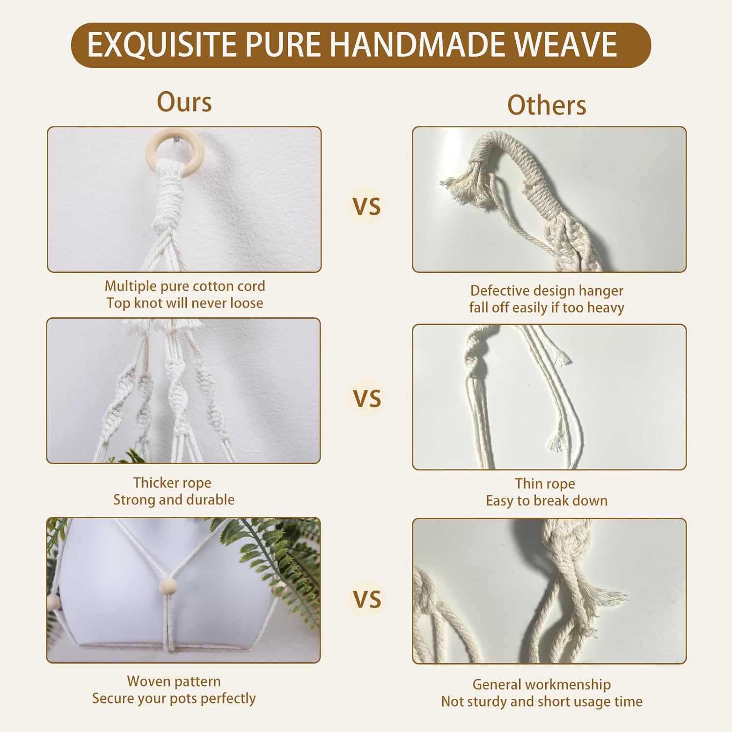 - HANDMADE WEAVING CRAFT - Hanging plant holders made from eco-friendly recycled cotton rope and wooded ring, It has a strong flexible woven design, sturdy and durable, accommodates planters of all shapes and sizes, you can take them home for your plants with confidence