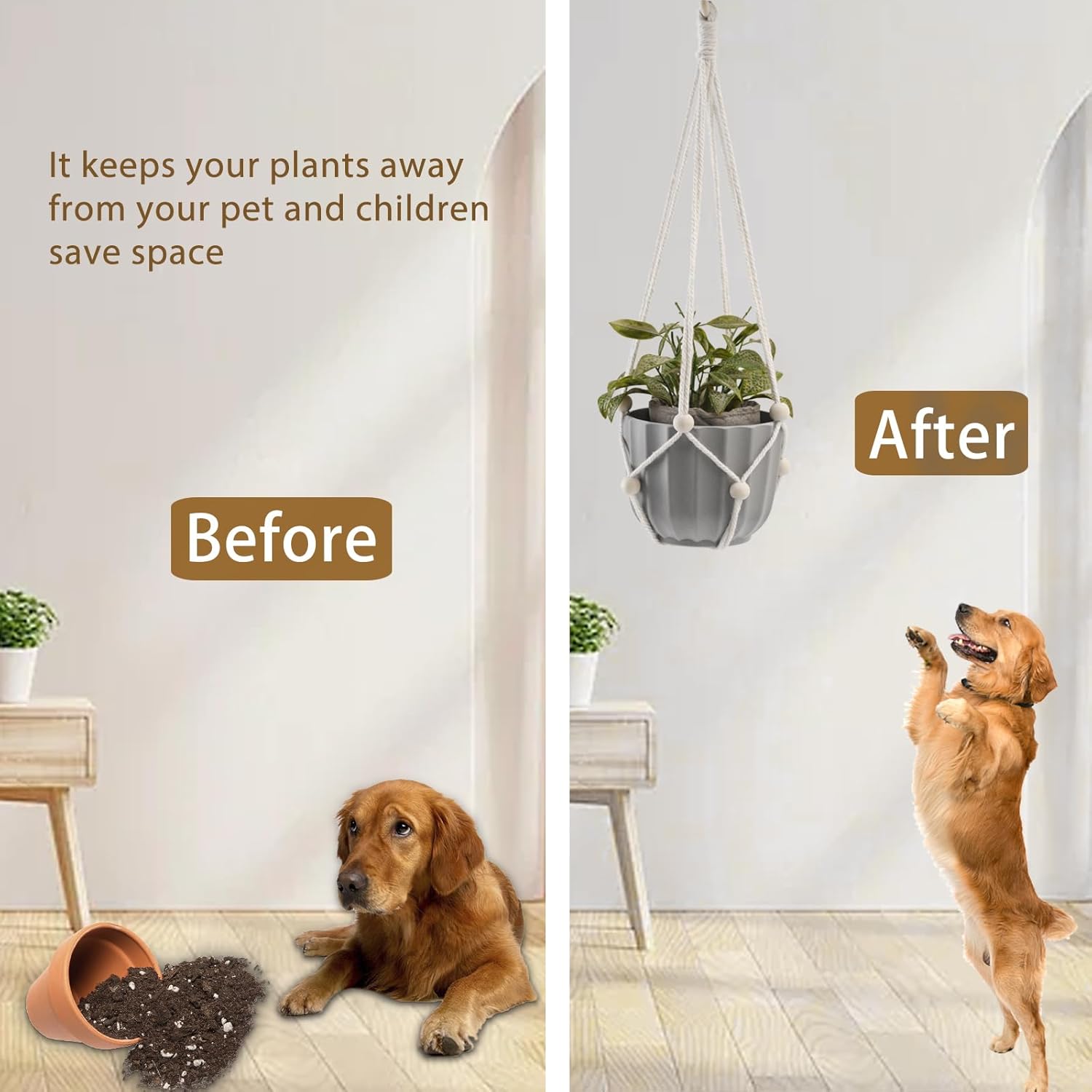 - ADJUSTABLE WOOD BEADS - You can easily adjust it by moving the wooden beads up and down to perfectly fix the pots. You can hang macrame plant hanger in your living room, hall, office ceiling and anywhere you like. Kids and pets can no longer mess up your potted plants