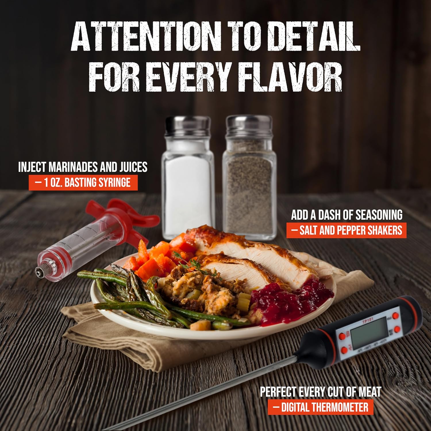 - Included Components : Carrying Case, Flavour injector, Meat Thermostat, Salt & Pepper Shakers