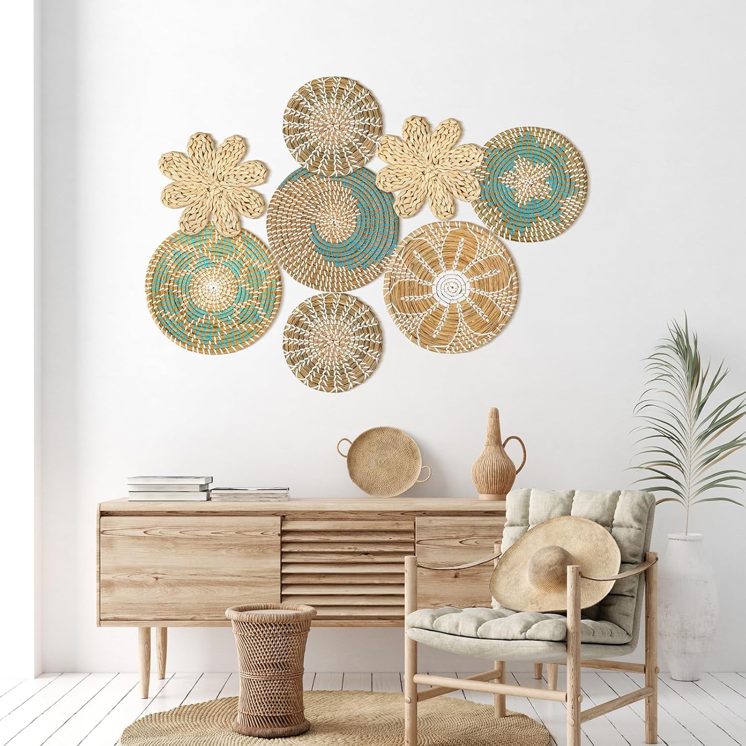 Xuhal Set of 8 Hanging Woven Wall Basket Handmade Decorative Rustic Boho Basket Decor Handcrafted Wicker Round Seagrass Wall Art for Home Kitchen Farmhouse Table Living Room