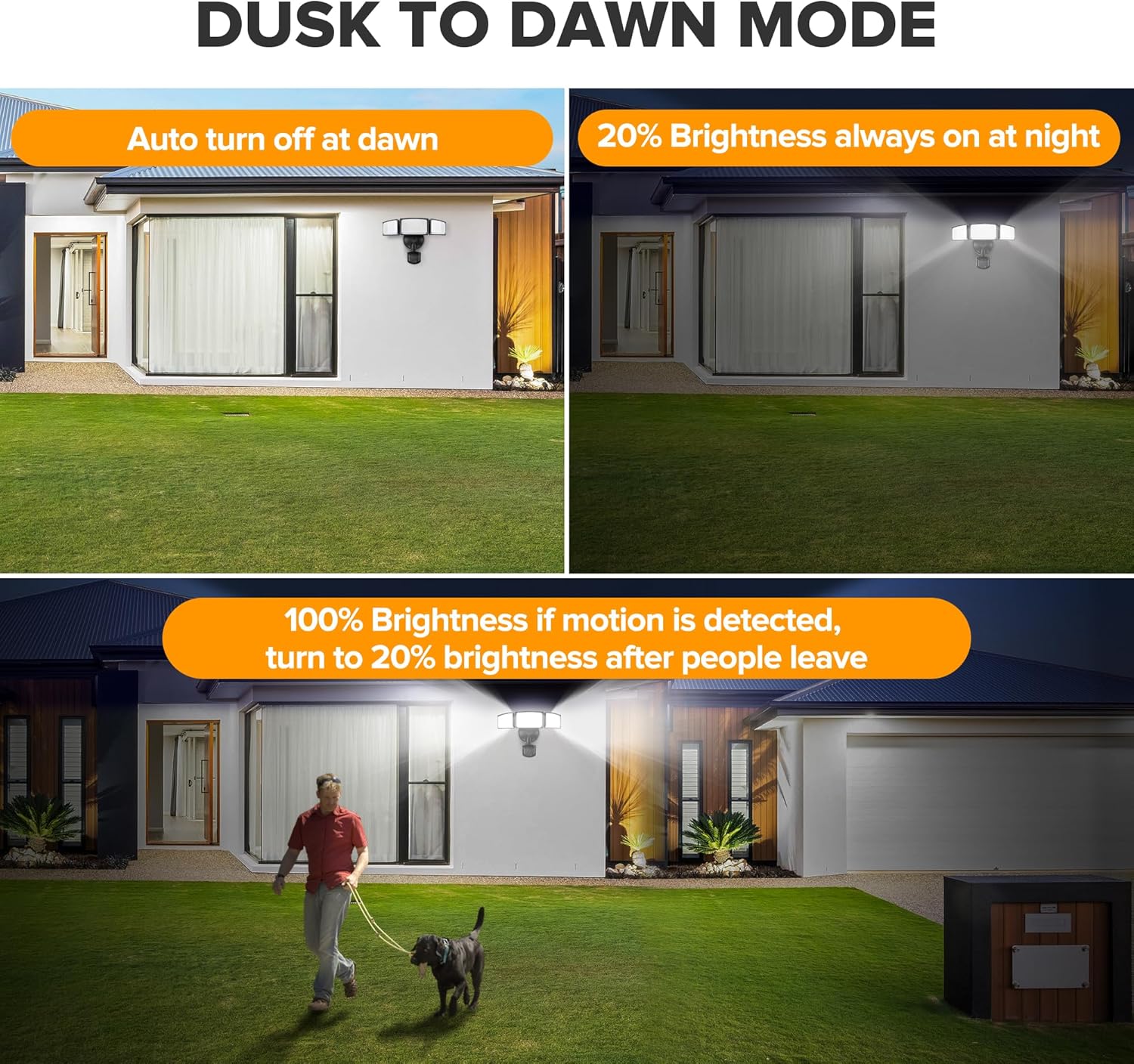 - 4 Lighting Modes: The motion sensor outdoor lights has 4 lighting modes: Test Mode, Security Mode, Dusk to Dawn Mode and Manual Override Mode. Different lighting way for your various usage requirements, suitable for the porch, garage, driveway, swimming pools, etc