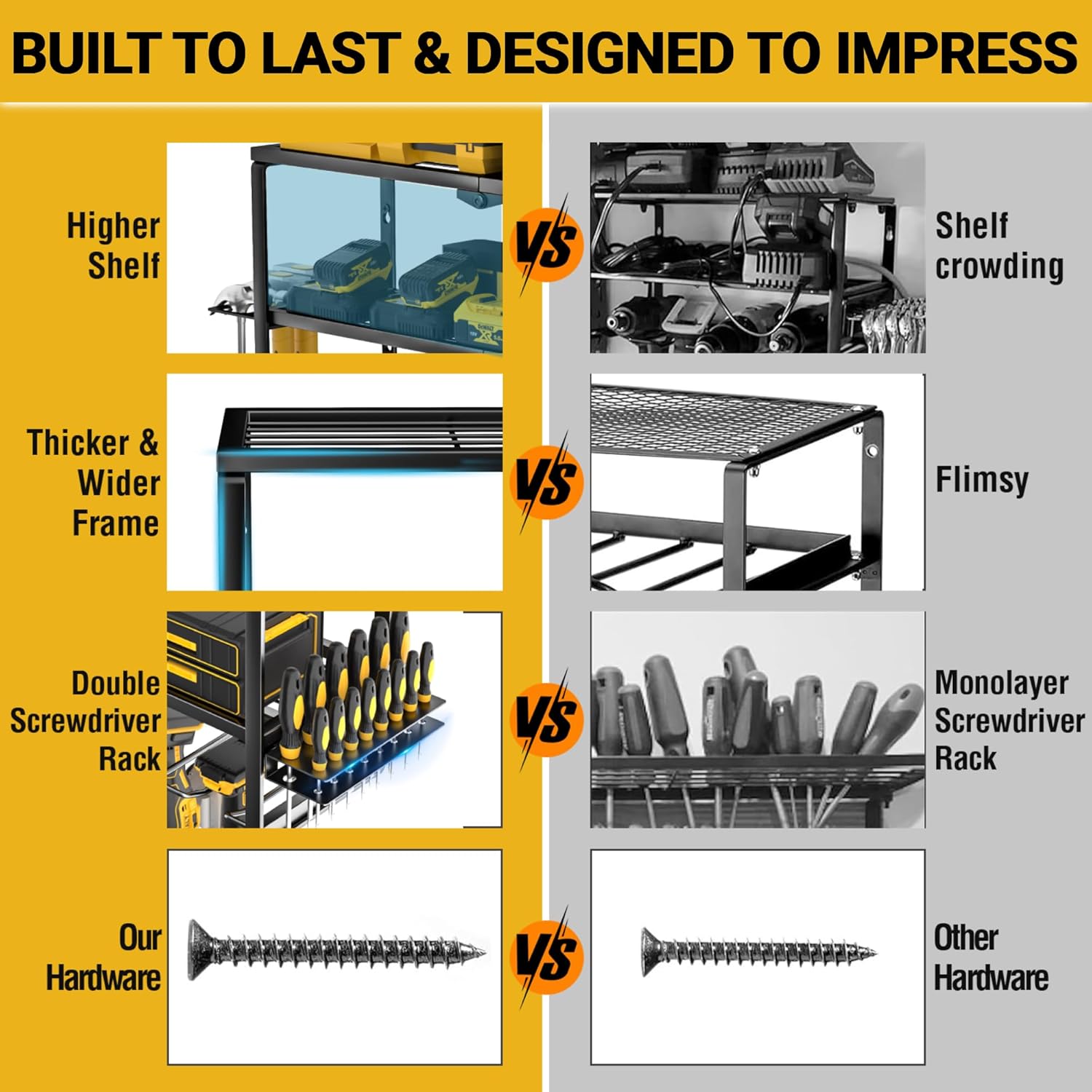 - 【HEAVY DUTY & DURABLE】:Most 3-tier tool rack on the market weigh only around 7 lbs, but we've upgraded ours to a solid 10.5 lbs by using thicker and stronger metal. This added weight means greater load capacity, improved stability, and longer-lasting durability — ideal for holding power tools without bending or wobbling over time.