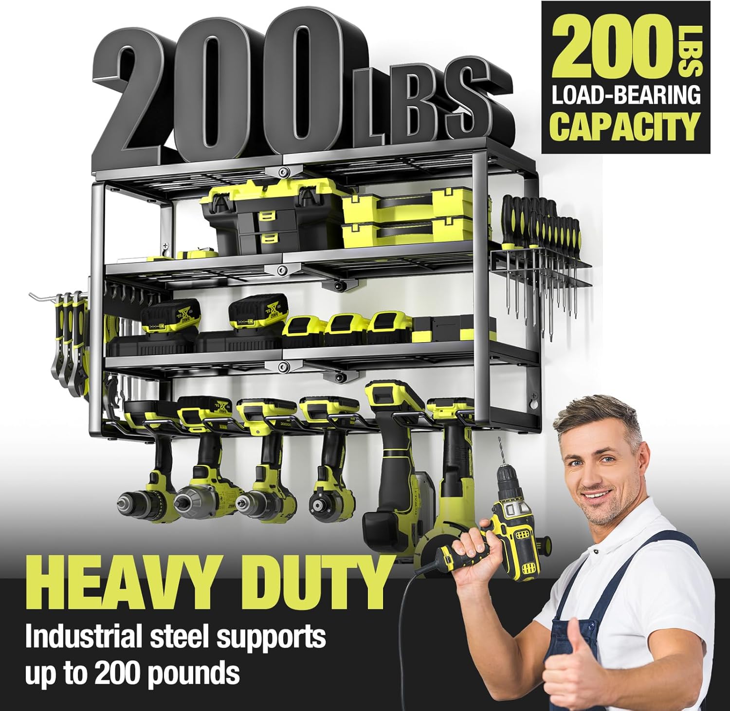 - 【HEAVY DUTY & DURABLE】:This cordless tool organizer is made of heavy compact steel metal, with plenty of load-bearing testing, our storage rack can hold your power tools of any weight. The durable black powder coating prevents rusting and lasts a lifetime