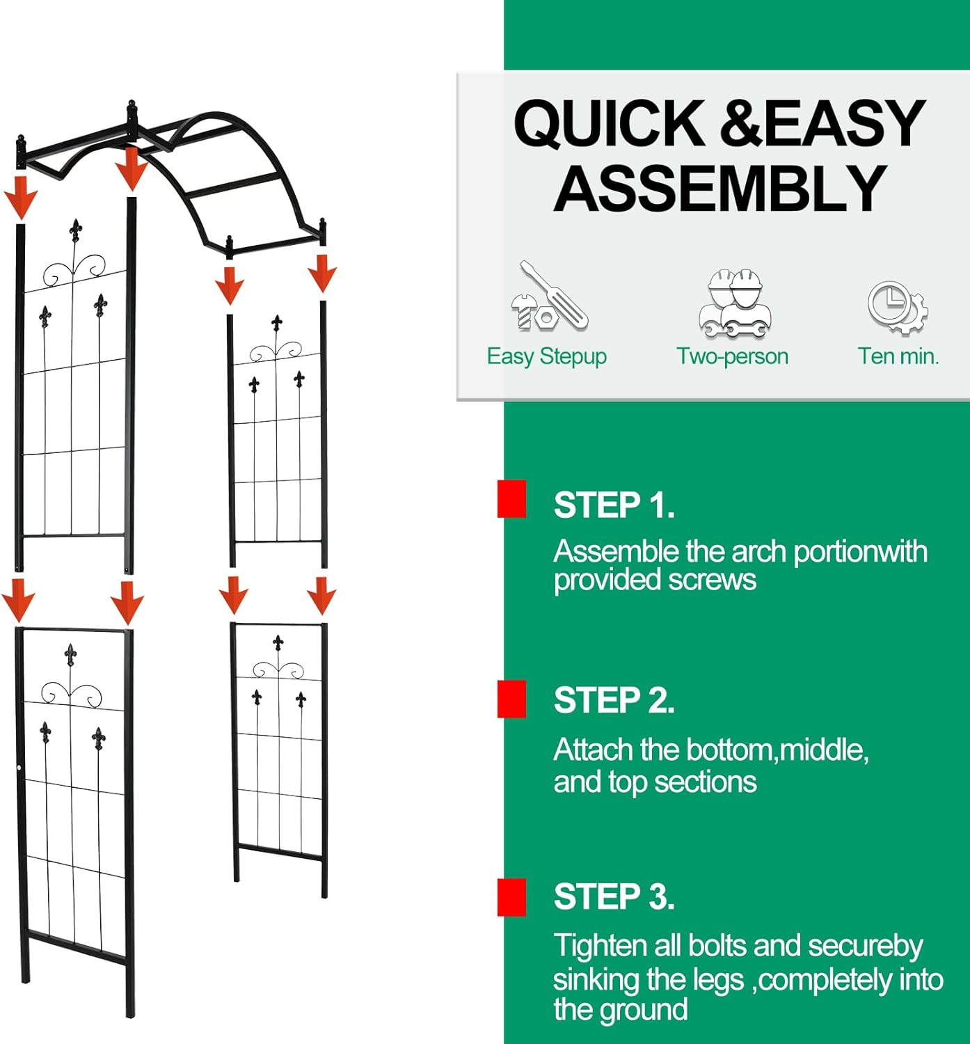 - Easy to Assemble:Pre-cut and pre-drilled holes, Instruction is provided. And it can be assembled easily by a single person. Lightweight and simple arbor construction for easy assemble and carry.