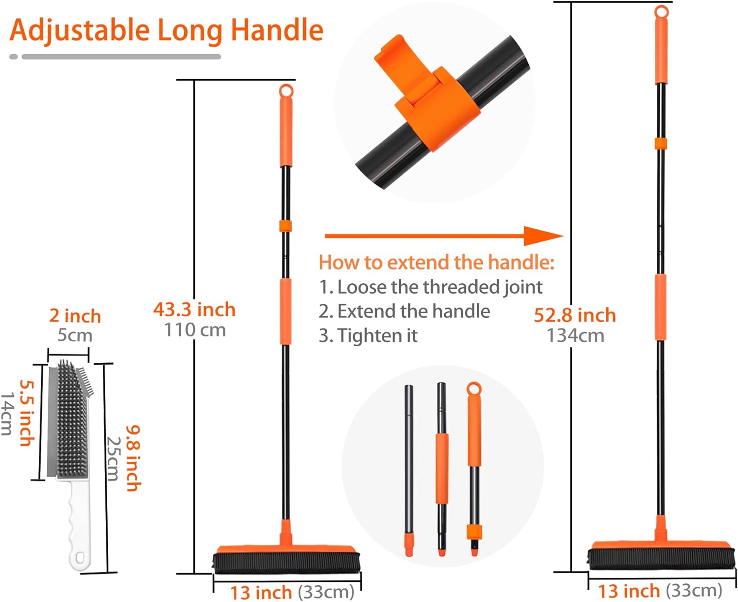 - Telescopic Handle - The pole length of this dog hair broom can be adjusted from 43.3 inches to 52.8 inches. No more bending over to cleaning. You can rotate the threaded joint two circles and extend it. Then screw 2 circles to lock the handle in place