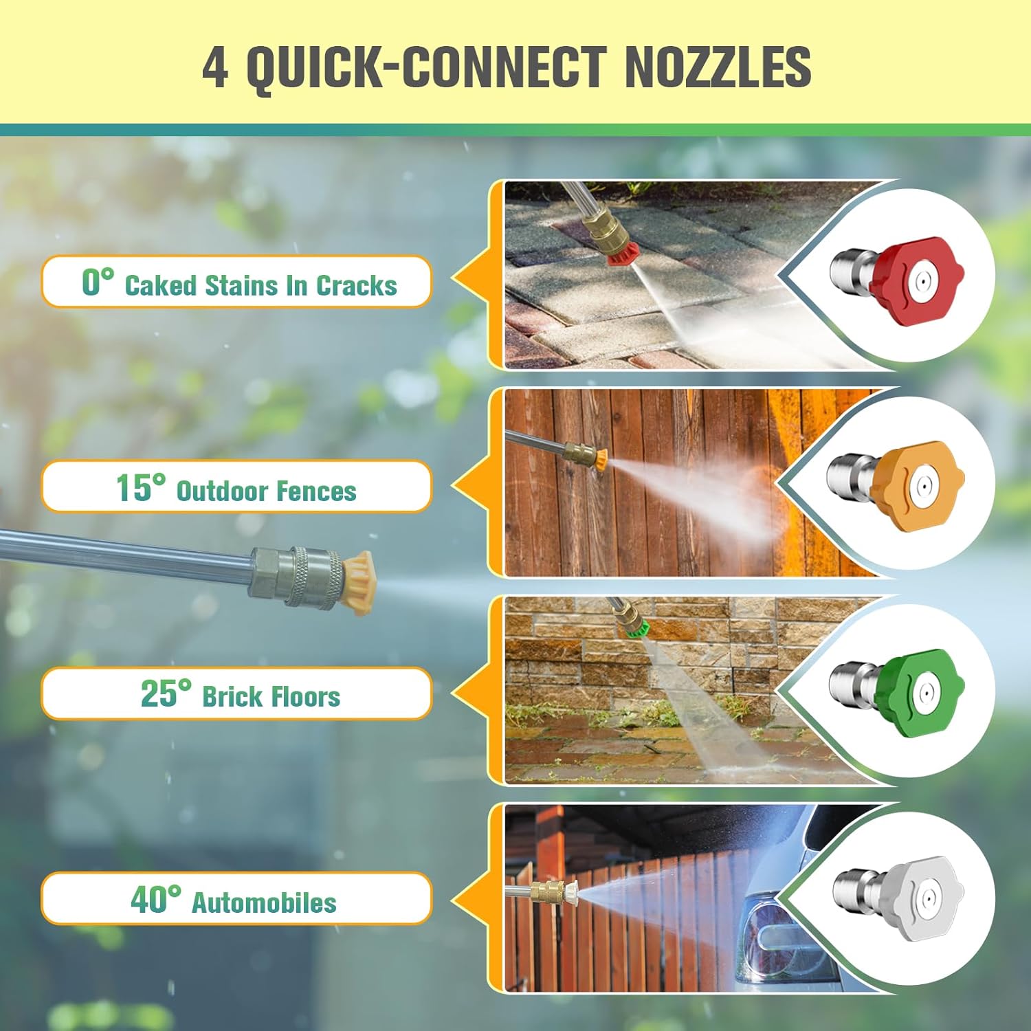 - Four versatile nozzles and a 16.9 oz foam tank create rich bubbles for superior cleaning of cars and surfaces.