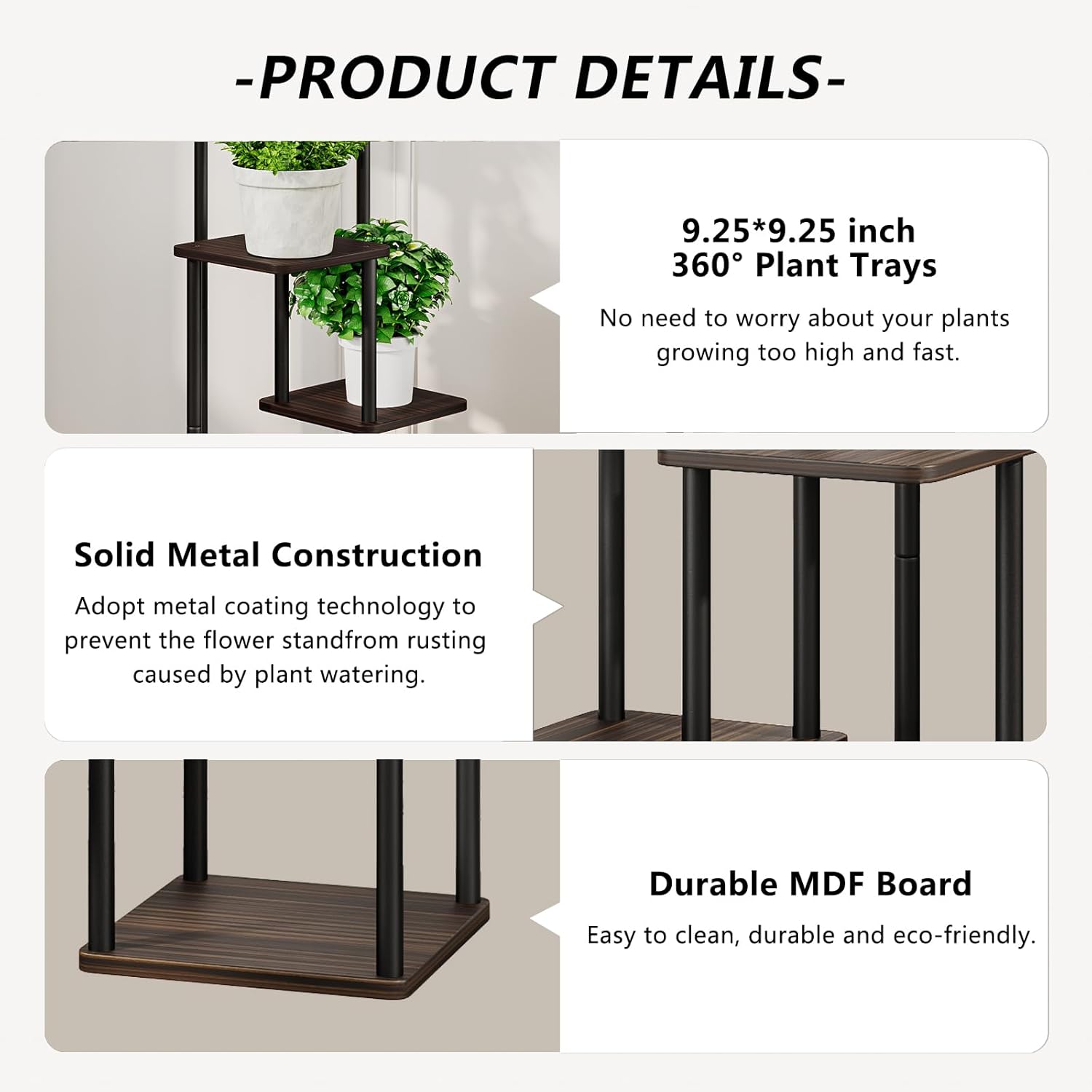 - 【Keep Balance & Stable】 The corner plant stand is mode of durable matal and MDF board, which has a smooth surface, with the function of compression resistance, waterproof, and stable structure. The bottom of the plant rack with 4 anti-slip foot stickers , holding your heavy-duty potted plant securely without scratching the floor.