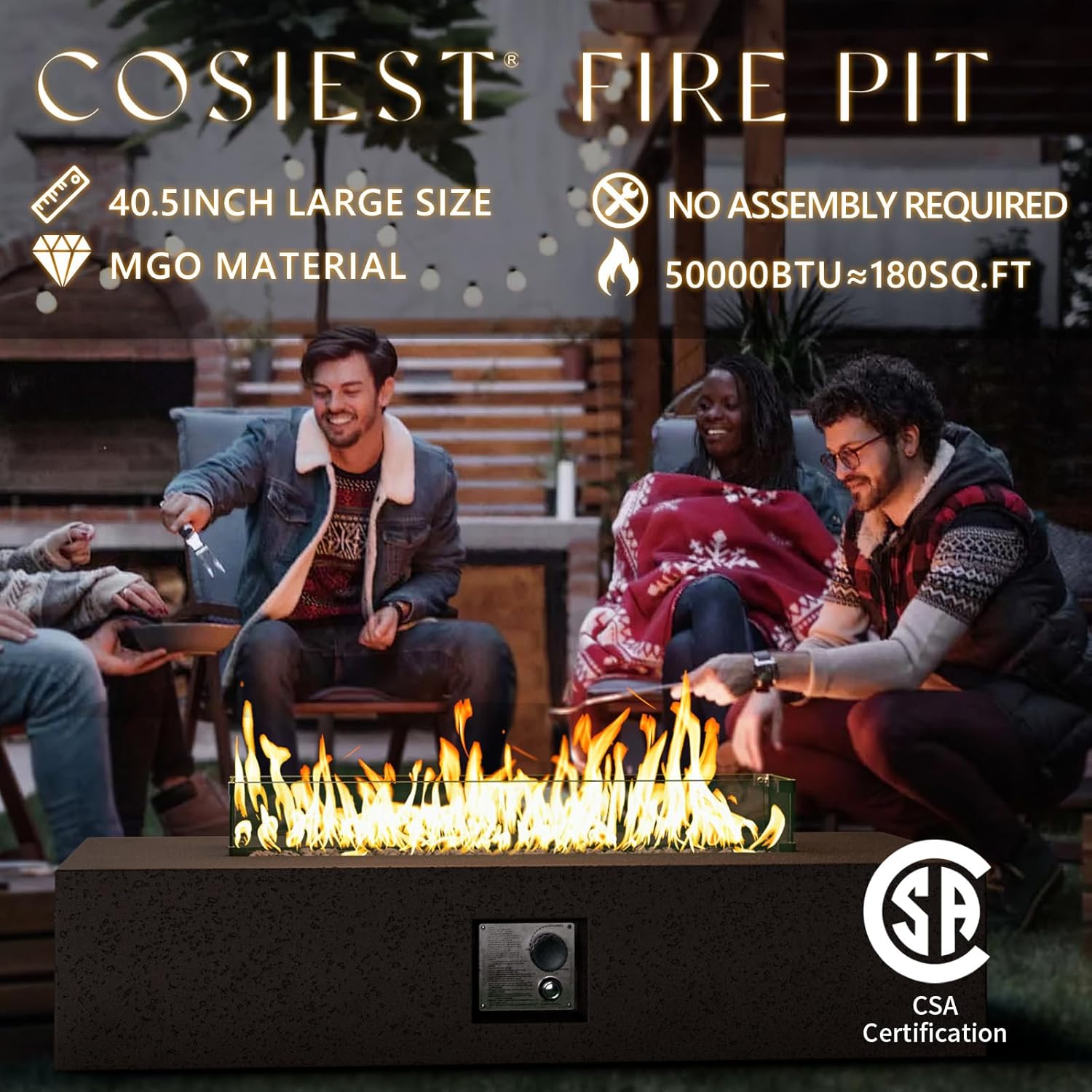 COSIEST 56 x 28 inch Outdoor Propane Fire Pit Coffee Table w Concrete Rectangle Base, CSA Certified, 50,000 BTU, Free Lava Rocks and RainCover, Fits 20lb Tank Outside, Wind Guard, Tank Cover, Brown