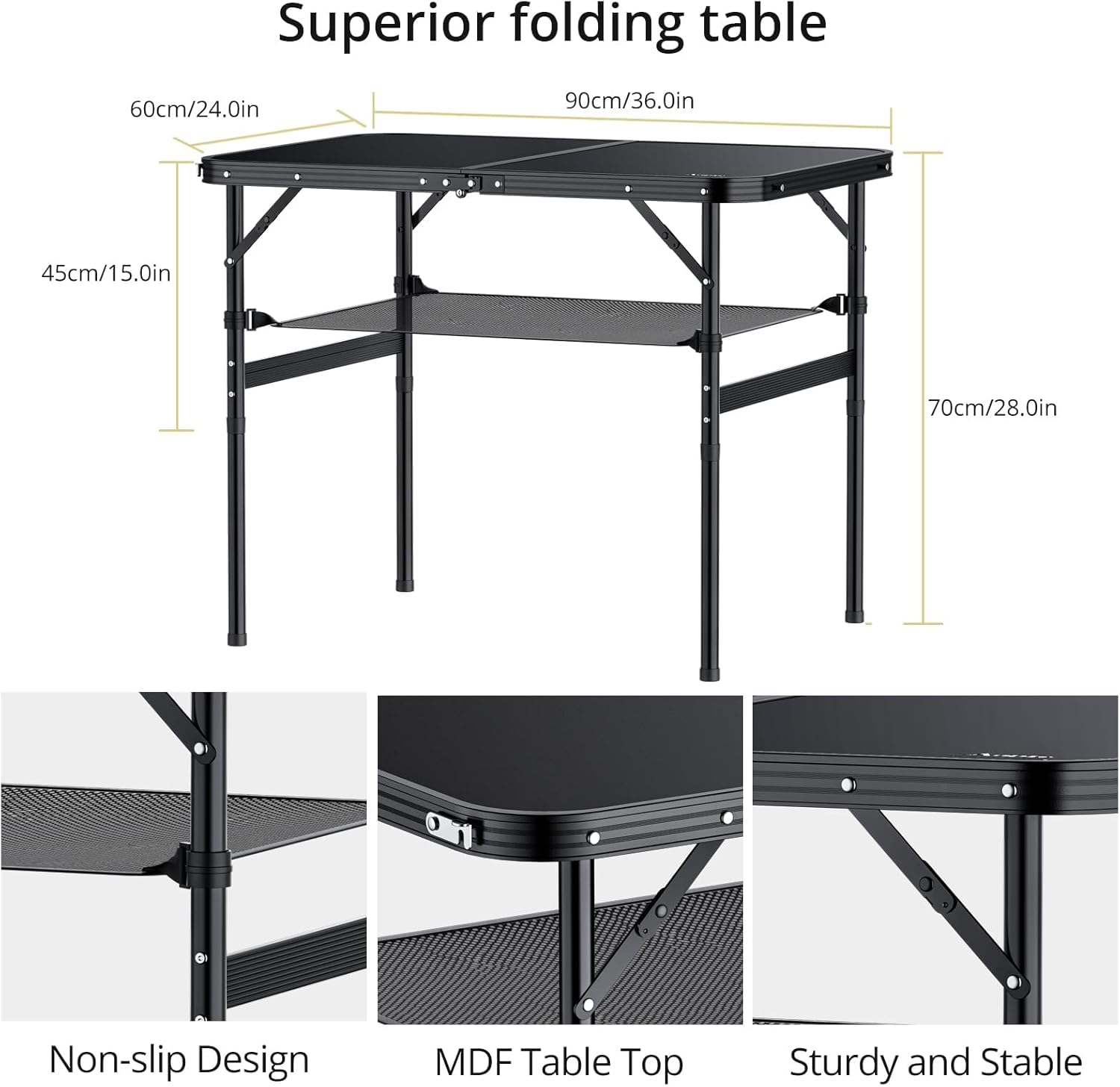 - Premium Materials, Stable and Lightweight: The entire frame of the portable table is made of thick aluminum alloy, weighing 7.7lbs, but can withstand 70lbs, making it sturdy. Black table top made of MDF(Medium Density Fiberboard) material is smooth, easy to clean, and also very stain resistant
