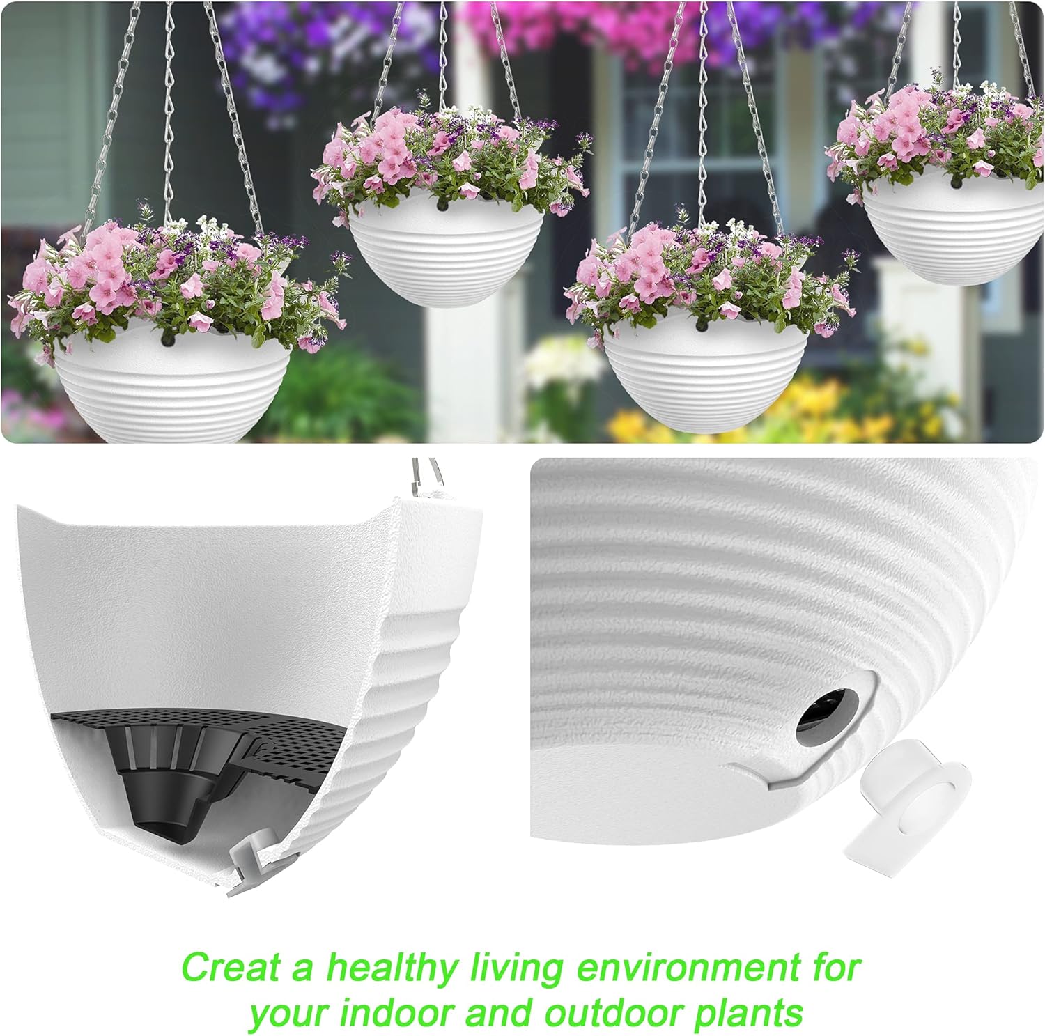 - 【Heavy Duty Chain Hanger】 Each hanging baskets outdoor comes with a heavy-duty iron triple-chain hanger, 15.5" length of chain, strong and balanced, ensuring secure support while hanging. The installation of the chain is also very simple. You can directly buckle the clips into the preset hole of the flower pot and then hang it for use.
